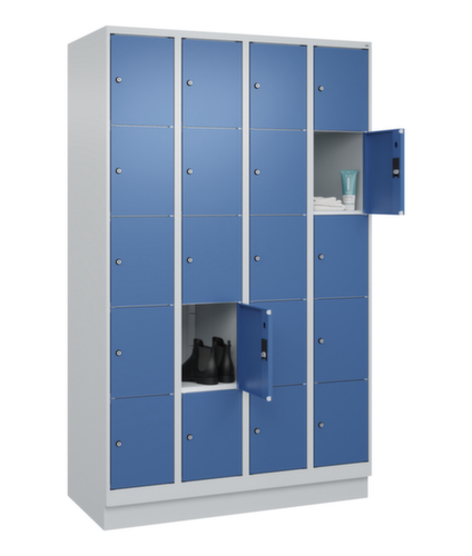 Les principales dimensions de C+P l’armoire multicases Classic Plus en un coup d’œil :corps avec porte battante simple. Les gonds intérieurs des portes battantes offrent l’avantage d’un visuel net, car aucune vis ou charnière n’est visible de l’extérieur. Le design de l’armoire n’est donc pas altéré et l’ensemble du meuble semble de meilleure qualité. La surface lisse est également plus facile à nettoyer, car aucun dépôt de saleté ou de poussière n’est à craindre aux endroits inaccessibles. Chaque porte est équipée de série d’un amortisseur, de sorte que, même fermée avec élan, elle ne claque pas. Cela contribue non seulement à améliorer l’environnement sonore, mais protège aussi l’armoire en acier des dommages. La structure BIONIC Steel Frame, inspirée de la nature, est une construction particulièrement efficace et stable. La structure interne raffinée composée de pliages, d’entretoises et d’espaces, ainsi que la plus grande épaisseur de matériau aux endroits cruciaux, comme à l’avant des parois latérales et dans les profilés de cloisons et de caissons, augmentent encore la rigidité. verrouillable avec serrure à cylindre. Le socle encastré permet de répartir uniformément le poids de l’armoire sur le sol. Cela augmente la stabilité et l’armoire peut supporter des charges plus lourdes qu’une armoire à pieds. De plus, la saleté, la poussière et l’humidité ne peuvent pas s’infiltrer sous l’armoire, ce qui réduit la surface de nettoyage. structure en acier, soudé de manière stable. Cela rend la structure particulièrement robuste et résistante, et donc plus durable. Les coins et les angles soudés du corps garantissent une plus grande étanchéité et donc une meilleure protection contre la poussière, l’humidité et la saleté qu’une structure vissée. En outre, il n’est pas nécessaire de procéder à des travaux d’entretien réguliers ni à des réajustements. corps avec thermolaquage en RAL7035 gris clair. face avant avec thermolaquage en RAL5023 bleu distant.