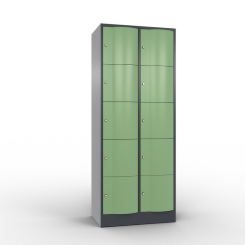 La porte battante convexe vers l’avant est absolument stable et résistante au vandalisme, même aux coups de pied. Les portes battantes sont montées sur des charnières robustes à espagnolettes internes et résistent ainsi à des sollicitations élevées. Chaque porte est équipée de série d’un amortisseur, de sorte que, même fermée avec élan, elle ne claque pas. Cela contribue non seulement à améliorer l’environnement sonore, mais protège aussi l’armoire en acier des dommages. De plus, la limitation d’ouverture de porte protège la porte contre l’extension excessive et contre le chevauchement de la surface utile avec l’armoire annexe. verrouillable avec serrure à cylindre. Les orifices de ventilation dans la paroi arrière assurent une bonne circulation de l’air dans chaque casier. Grâce au plateau supérieur, l’armoire à poser peut être utilisée comme surface de travail ou tablette supplémentaire. Le socle encastré permet de répartir uniformément le poids de l’armoire sur le sol. Cela augmente la stabilité et l’armoire peut supporter des charges plus lourdes qu’une armoire à pieds. De plus, la saleté, la poussière et l’humidité ne peuvent pas s’infiltrer sous l’armoire, ce qui réduit la surface de nettoyage. structure en tôle d'acier, soudé. corps avec thermolaquage. face avant avec thermolaquage.