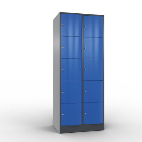 La porte battante convexe vers l’avant est absolument stable et résistante au vandalisme, même aux coups de pied. Les portes battantes sont montées sur des charnières robustes à espagnolettes internes et résistent ainsi à des sollicitations élevées. Chaque porte est équipée de série d’un amortisseur, de sorte que, même fermée avec élan, elle ne claque pas. Cela contribue non seulement à améliorer l’environnement sonore, mais protège aussi l’armoire en acier des dommages. De plus, la limitation d’ouverture de porte protège la porte contre l’extension excessive et contre le chevauchement de la surface utile avec l’armoire annexe. verrouillable avec serrure à cylindre. Les orifices de ventilation dans la paroi arrière assurent une bonne circulation de l’air dans chaque casier. Grâce au plateau supérieur, l’armoire à poser peut être utilisée comme surface de travail ou tablette supplémentaire. Le socle encastré permet de répartir uniformément le poids de l’armoire sur le sol. Cela augmente la stabilité et l’armoire peut supporter des charges plus lourdes qu’une armoire à pieds. De plus, la saleté, la poussière et l’humidité ne peuvent pas s’infiltrer sous l’armoire, ce qui réduit la surface de nettoyage. structure en tôle d'acier, soudé. corps avec thermolaquage. face avant avec thermolaquage.