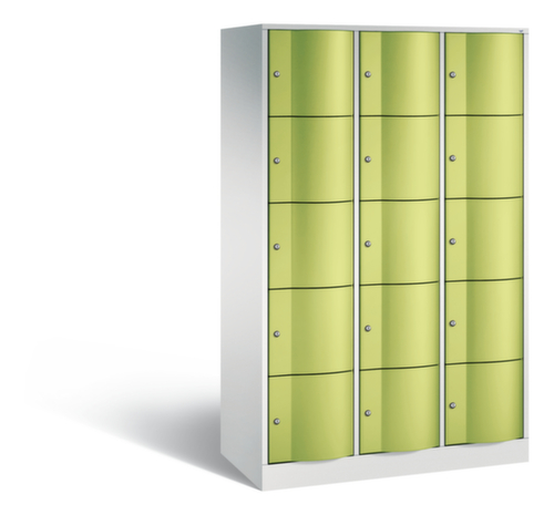 La porte battante convexe vers l’avant est absolument stable et résistante au vandalisme, même aux coups de pied. Les portes battantes sont montées sur des charnières robustes à espagnolettes internes et résistent ainsi à des sollicitations élevées. Chaque porte est équipée de série d’un amortisseur, de sorte que, même fermée avec élan, elle ne claque pas. Cela contribue non seulement à améliorer l’environnement sonore, mais protège aussi l’armoire en acier des dommages. De plus, la limitation d’ouverture de porte protège la porte contre l’extension excessive et contre le chevauchement de la surface utile avec l’armoire annexe. verrouillable avec serrure à cylindre. Les orifices de ventilation dans la paroi arrière assurent une bonne circulation de l’air dans chaque casier. Grâce au plateau supérieur, l’armoire à poser peut être utilisée comme surface de travail ou tablette supplémentaire. Le socle encastré permet de répartir uniformément le poids de l’armoire sur le sol. Cela augmente la stabilité et l’armoire peut supporter des charges plus lourdes qu’une armoire à pieds. De plus, la saleté, la poussière et l’humidité ne peuvent pas s’infiltrer sous l’armoire, ce qui réduit la surface de nettoyage. structure en tôle d'acier, soudé. corps avec thermolaquage. face avant avec thermolaquage.