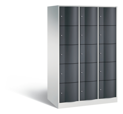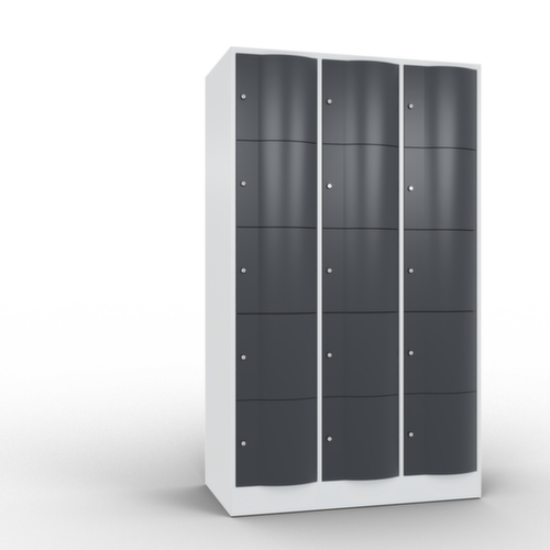 La porte battante convexe vers l’avant est absolument stable et résistante au vandalisme, même aux coups de pied. Les portes battantes sont montées sur des charnières robustes à espagnolettes internes et résistent ainsi à des sollicitations élevées. Chaque porte est équipée de série d’un amortisseur, de sorte que, même fermée avec élan, elle ne claque pas. Cela contribue non seulement à améliorer l’environnement sonore, mais protège aussi l’armoire en acier des dommages. De plus, la limitation d’ouverture de porte protège la porte contre l’extension excessive et contre le chevauchement de la surface utile avec l’armoire annexe. verrouillable avec serrure à cylindre. Les orifices de ventilation dans la paroi arrière assurent une bonne circulation de l’air dans chaque casier. Grâce au plateau supérieur, l’armoire à poser peut être utilisée comme surface de travail ou tablette supplémentaire. Le socle encastré permet de répartir uniformément le poids de l’armoire sur le sol. Cela augmente la stabilité et l’armoire peut supporter des charges plus lourdes qu’une armoire à pieds. De plus, la saleté, la poussière et l’humidité ne peuvent pas s’infiltrer sous l’armoire, ce qui réduit la surface de nettoyage. structure en tôle d'acier, soudé. corps avec thermolaquage. face avant avec thermolaquage.