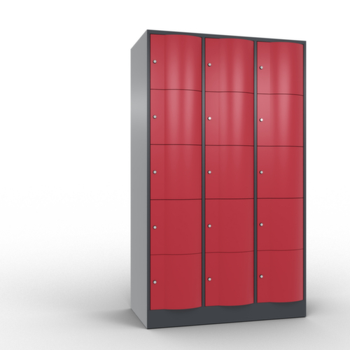 La porte battante convexe vers l’avant est absolument stable et résistante au vandalisme, même aux coups de pied. Les portes battantes sont montées sur des charnières robustes à espagnolettes internes et résistent ainsi à des sollicitations élevées. Chaque porte est équipée de série d’un amortisseur, de sorte que, même fermée avec élan, elle ne claque pas. Cela contribue non seulement à améliorer l’environnement sonore, mais protège aussi l’armoire en acier des dommages. De plus, la limitation d’ouverture de porte protège la porte contre l’extension excessive et contre le chevauchement de la surface utile avec l’armoire annexe. verrouillable avec serrure à cylindre. Les orifices de ventilation dans la paroi arrière assurent une bonne circulation de l’air dans chaque casier. Grâce au plateau supérieur, l’armoire à poser peut être utilisée comme surface de travail ou tablette supplémentaire. Le socle encastré permet de répartir uniformément le poids de l’armoire sur le sol. Cela augmente la stabilité et l’armoire peut supporter des charges plus lourdes qu’une armoire à pieds. De plus, la saleté, la poussière et l’humidité ne peuvent pas s’infiltrer sous l’armoire, ce qui réduit la surface de nettoyage. structure en tôle d'acier, soudé. corps avec thermolaquage. face avant avec thermolaquage.