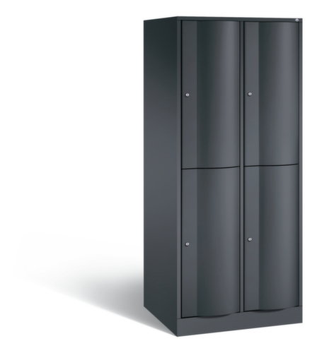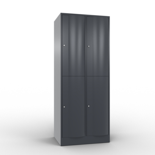 La porte battante convexe vers l’avant est absolument stable et résistante au vandalisme, même aux coups de pied. Les portes battantes sont montées sur des charnières robustes à espagnolettes internes et résistent ainsi à des sollicitations élevées. Chaque porte est équipée de série d’un amortisseur, de sorte que, même fermée avec élan, elle ne claque pas. Cela contribue non seulement à améliorer l’environnement sonore, mais protège aussi l’armoire en acier des dommages. De plus, la limitation d’ouverture de porte protège la porte contre l’extension excessive et contre le chevauchement de la surface utile avec l’armoire annexe. verrouillable avec serrure à cylindre. Les orifices de ventilation dans la paroi arrière assurent une bonne circulation de l’air dans chaque casier. Grâce au plateau supérieur, l’armoire à poser peut être utilisée comme surface de travail ou tablette supplémentaire. Le socle encastré permet de répartir uniformément le poids de l’armoire sur le sol. Cela augmente la stabilité et l’armoire peut supporter des charges plus lourdes qu’une armoire à pieds. De plus, la saleté, la poussière et l’humidité ne peuvent pas s’infiltrer sous l’armoire, ce qui réduit la surface de nettoyage. structure en tôle d'acier, soudé. corps avec thermolaquage. face avant avec thermolaquage.