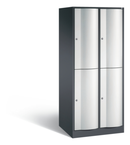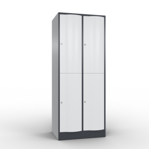 La porte battante convexe vers l’avant est absolument stable et résistante au vandalisme, même aux coups de pied. Les portes battantes sont montées sur des charnières robustes à espagnolettes internes et résistent ainsi à des sollicitations élevées. Chaque porte est équipée de série d’un amortisseur, de sorte que, même fermée avec élan, elle ne claque pas. Cela contribue non seulement à améliorer l’environnement sonore, mais protège aussi l’armoire en acier des dommages. De plus, la limitation d’ouverture de porte protège la porte contre l’extension excessive et contre le chevauchement de la surface utile avec l’armoire annexe. verrouillable avec serrure à cylindre. Les orifices de ventilation dans la paroi arrière assurent une bonne circulation de l’air dans chaque casier. Grâce au plateau supérieur, l’armoire à poser peut être utilisée comme surface de travail ou tablette supplémentaire. Le socle encastré permet de répartir uniformément le poids de l’armoire sur le sol. Cela augmente la stabilité et l’armoire peut supporter des charges plus lourdes qu’une armoire à pieds. De plus, la saleté, la poussière et l’humidité ne peuvent pas s’infiltrer sous l’armoire, ce qui réduit la surface de nettoyage. structure en tôle d'acier, soudé. corps avec thermolaquage. face avant avec thermolaquage.