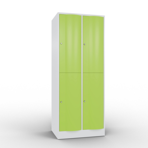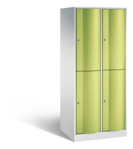 La porte battante convexe vers l’avant est absolument stable et résistante au vandalisme, même aux coups de pied. Les portes battantes sont montées sur des charnières robustes à espagnolettes internes et résistent ainsi à des sollicitations élevées. Chaque porte est équipée de série d’un amortisseur, de sorte que, même fermée avec élan, elle ne claque pas. Cela contribue non seulement à améliorer l’environnement sonore, mais protège aussi l’armoire en acier des dommages. De plus, la limitation d’ouverture de porte protège la porte contre l’extension excessive et contre le chevauchement de la surface utile avec l’armoire annexe. verrouillable avec serrure à cylindre. Les orifices de ventilation dans la paroi arrière assurent une bonne circulation de l’air dans chaque casier. Grâce au plateau supérieur, l’armoire à poser peut être utilisée comme surface de travail ou tablette supplémentaire. Le socle encastré permet de répartir uniformément le poids de l’armoire sur le sol. Cela augmente la stabilité et l’armoire peut supporter des charges plus lourdes qu’une armoire à pieds. De plus, la saleté, la poussière et l’humidité ne peuvent pas s’infiltrer sous l’armoire, ce qui réduit la surface de nettoyage. structure en tôle d'acier, soudé. corps avec thermolaquage. face avant avec thermolaquage.