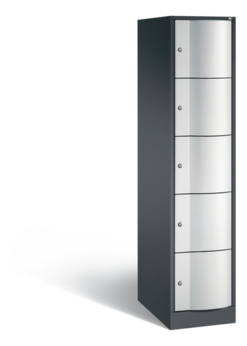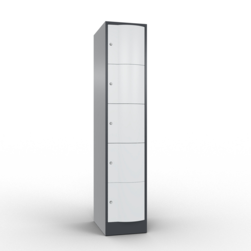 La porte battante convexe vers l’avant est absolument stable et résistante au vandalisme, même aux coups de pied. Les portes battantes sont montées sur des charnières robustes à espagnolettes internes et résistent ainsi à des sollicitations élevées. Chaque porte est équipée de série d’un amortisseur, de sorte que, même fermée avec élan, elle ne claque pas. Cela contribue non seulement à améliorer l’environnement sonore, mais protège aussi l’armoire en acier des dommages. De plus, la limitation d’ouverture de porte protège la porte contre l’extension excessive et contre le chevauchement de la surface utile avec l’armoire annexe. verrouillable avec serrure à cylindre. Les orifices de ventilation dans la paroi arrière assurent une bonne circulation de l’air dans chaque casier. Grâce au plateau supérieur, l’armoire à poser peut être utilisée comme surface de travail ou tablette supplémentaire. Le socle encastré permet de répartir uniformément le poids de l’armoire sur le sol. Cela augmente la stabilité et l’armoire peut supporter des charges plus lourdes qu’une armoire à pieds. De plus, la saleté, la poussière et l’humidité ne peuvent pas s’infiltrer sous l’armoire, ce qui réduit la surface de nettoyage. structure en tôle d'acier, soudé. corps avec thermolaquage. face avant avec thermolaquage.