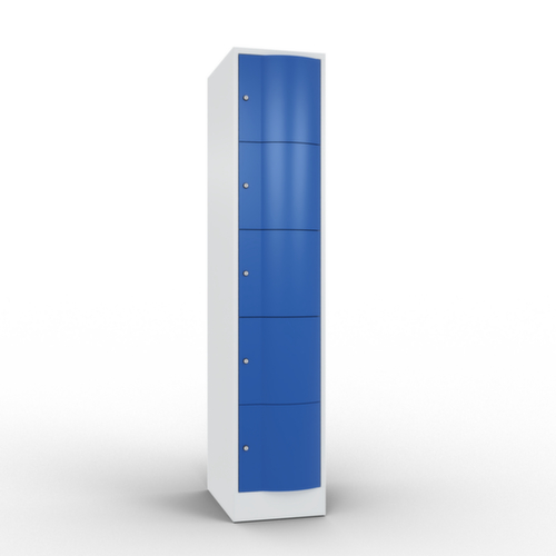 La porte battante convexe vers l’avant est absolument stable et résistante au vandalisme, même aux coups de pied. Les portes battantes sont montées sur des charnières robustes à espagnolettes internes et résistent ainsi à des sollicitations élevées. Chaque porte est équipée de série d’un amortisseur, de sorte que, même fermée avec élan, elle ne claque pas. Cela contribue non seulement à améliorer l’environnement sonore, mais protège aussi l’armoire en acier des dommages. De plus, la limitation d’ouverture de porte protège la porte contre l’extension excessive et contre le chevauchement de la surface utile avec l’armoire annexe. verrouillable avec serrure à cylindre. Les orifices de ventilation dans la paroi arrière assurent une bonne circulation de l’air dans chaque casier. Grâce au plateau supérieur, l’armoire à poser peut être utilisée comme surface de travail ou tablette supplémentaire. Le socle encastré permet de répartir uniformément le poids de l’armoire sur le sol. Cela augmente la stabilité et l’armoire peut supporter des charges plus lourdes qu’une armoire à pieds. De plus, la saleté, la poussière et l’humidité ne peuvent pas s’infiltrer sous l’armoire, ce qui réduit la surface de nettoyage. structure en tôle d'acier, soudé. corps avec thermolaquage. face avant avec thermolaquage.