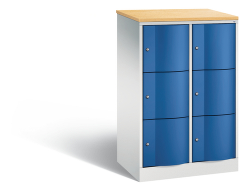 La porte battante convexe vers l’avant est absolument stable et résistante au vandalisme, même aux coups de pied. Les portes battantes sont montées sur des charnières robustes à espagnolettes internes et résistent ainsi à des sollicitations élevées. Chaque porte est équipée de série d’un amortisseur, de sorte que, même fermée avec élan, elle ne claque pas. Cela contribue non seulement à améliorer l’environnement sonore, mais protège aussi l’armoire en acier des dommages. De plus, la limitation d’ouverture de porte protège la porte contre l’extension excessive et contre le chevauchement de la surface utile avec l’armoire annexe. verrouillable avec serrure à cylindre. Les orifices de ventilation dans la paroi arrière assurent une bonne circulation de l’air dans chaque casier. Grâce au plateau supérieur, l’armoire à poser peut être utilisée comme surface de travail ou tablette supplémentaire. Le socle encastré permet de répartir uniformément le poids de l’armoire sur le sol. Cela augmente la stabilité et l’armoire peut supporter des charges plus lourdes qu’une armoire à pieds. De plus, la saleté, la poussière et l’humidité ne peuvent pas s’infiltrer sous l’armoire, ce qui réduit la surface de nettoyage. structure en tôle d'acier, soudé. corps avec thermolaquage. face avant avec thermolaquage. panneau finition comme couleur du corps.