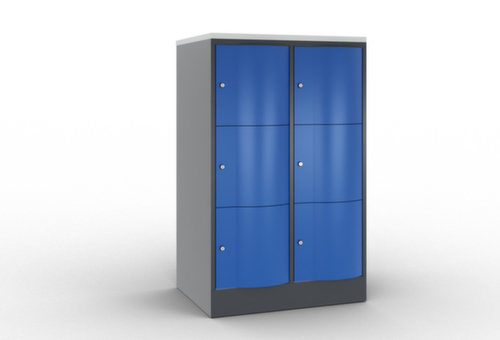 La porte battante convexe vers l’avant est absolument stable et résistante au vandalisme, même aux coups de pied. Les portes battantes sont montées sur des charnières robustes à espagnolettes internes et résistent ainsi à des sollicitations élevées. Chaque porte est équipée de série d’un amortisseur, de sorte que, même fermée avec élan, elle ne claque pas. Cela contribue non seulement à améliorer l’environnement sonore, mais protège aussi l’armoire en acier des dommages. De plus, la limitation d’ouverture de porte protège la porte contre l’extension excessive et contre le chevauchement de la surface utile avec l’armoire annexe. verrouillable avec serrure à cylindre. Les orifices de ventilation dans la paroi arrière assurent une bonne circulation de l’air dans chaque casier. Grâce au plateau supérieur, l’armoire à poser peut être utilisée comme surface de travail ou tablette supplémentaire. Le socle encastré permet de répartir uniformément le poids de l’armoire sur le sol. Cela augmente la stabilité et l’armoire peut supporter des charges plus lourdes qu’une armoire à pieds. De plus, la saleté, la poussière et l’humidité ne peuvent pas s’infiltrer sous l’armoire, ce qui réduit la surface de nettoyage. structure en tôle d'acier, soudé. corps avec thermolaquage. face avant avec thermolaquage. panneau finition comme couleur du corps.