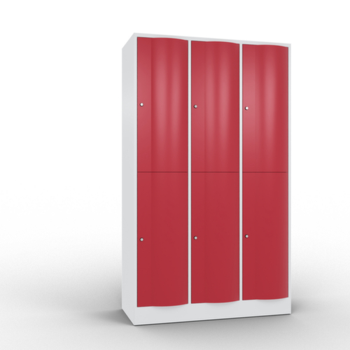 La porte battante convexe vers l’avant est absolument stable et résistante au vandalisme, même aux coups de pied. Les portes battantes sont montées sur des charnières robustes à espagnolettes internes et résistent ainsi à des sollicitations élevées. Chaque porte est équipée de série d’un amortisseur, de sorte que, même fermée avec élan, elle ne claque pas. Cela contribue non seulement à améliorer l’environnement sonore, mais protège aussi l’armoire en acier des dommages. De plus, la limitation d’ouverture de porte protège la porte contre l’extension excessive et contre le chevauchement de la surface utile avec l’armoire annexe. verrouillable avec serrure à cylindre. Les orifices de ventilation dans la paroi arrière assurent une bonne circulation de l’air dans chaque casier. Grâce au plateau supérieur, l’armoire à poser peut être utilisée comme surface de travail ou tablette supplémentaire. Le socle encastré permet de répartir uniformément le poids de l’armoire sur le sol. Cela augmente la stabilité et l’armoire peut supporter des charges plus lourdes qu’une armoire à pieds. De plus, la saleté, la poussière et l’humidité ne peuvent pas s’infiltrer sous l’armoire, ce qui réduit la surface de nettoyage. structure en tôle d'acier, soudé. corps avec thermolaquage. face avant avec thermolaquage.