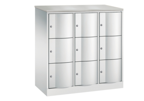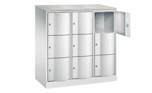 La porte battante convexe vers l’avant est absolument stable et résistante au vandalisme, même aux coups de pied. Les portes battantes sont montées sur des charnières robustes à espagnolettes internes et résistent ainsi à des sollicitations élevées. portes bombées vers l'extérieur avec charnière à espagnolette et amortisseur. Chaque porte est équipée de série d’un amortisseur, de sorte que, même fermée avec élan, elle ne claque pas. Cela contribue non seulement à améliorer l’environnement sonore, mais protège aussi l’armoire en acier des dommages. De plus, la limitation d’ouverture de porte protège la porte contre l’extension excessive et contre le chevauchement de la surface utile avec l’armoire annexe. verrouillable avec serrure à cylindre. Les orifices de ventilation dans la paroi arrière assurent une bonne circulation de l’air dans chaque casier. Grâce au plateau supérieur, l’armoire à poser peut être utilisée comme surface de travail ou tablette supplémentaire. Le socle encastré permet de répartir uniformément le poids de l’armoire sur le sol. Cela augmente la stabilité et l’armoire peut supporter des charges plus lourdes qu’une armoire à pieds. De plus, la saleté, la poussière et l’humidité ne peuvent pas s’infiltrer sous l’armoire, ce qui réduit la surface de nettoyage. structure en tôle d'acier, soudé. corps avec thermolaquage en noir. face avant avec thermolaquage en coloris alu. panneau finition comme couleur du corps.