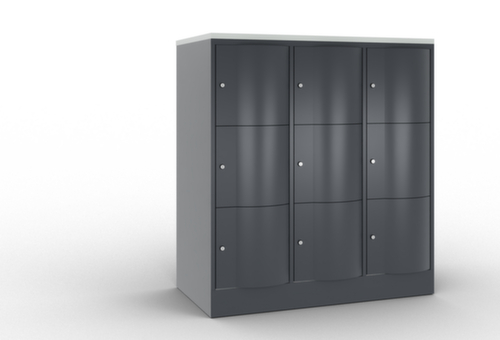 La porte battante convexe vers l’avant est absolument stable et résistante au vandalisme, même aux coups de pied. Les portes battantes sont montées sur des charnières robustes à espagnolettes internes et résistent ainsi à des sollicitations élevées. Chaque porte est équipée de série d’un amortisseur, de sorte que, même fermée avec élan, elle ne claque pas. Cela contribue non seulement à améliorer l’environnement sonore, mais protège aussi l’armoire en acier des dommages. De plus, la limitation d’ouverture de porte protège la porte contre l’extension excessive et contre le chevauchement de la surface utile avec l’armoire annexe. verrouillable avec serrure à cylindre. Les orifices de ventilation dans la paroi arrière assurent une bonne circulation de l’air dans chaque casier. Grâce au plateau supérieur, l’armoire à poser peut être utilisée comme surface de travail ou tablette supplémentaire. Le socle encastré permet de répartir uniformément le poids de l’armoire sur le sol. Cela augmente la stabilité et l’armoire peut supporter des charges plus lourdes qu’une armoire à pieds. De plus, la saleté, la poussière et l’humidité ne peuvent pas s’infiltrer sous l’armoire, ce qui réduit la surface de nettoyage. structure en tôle d'acier, soudé. corps avec thermolaquage. face avant avec thermolaquage. panneau finition comme couleur du corps.