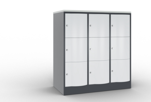 La porte battante convexe vers l’avant est absolument stable et résistante au vandalisme, même aux coups de pied. Les portes battantes sont montées sur des charnières robustes à espagnolettes internes et résistent ainsi à des sollicitations élevées. Chaque porte est équipée de série d’un amortisseur, de sorte que, même fermée avec élan, elle ne claque pas. Cela contribue non seulement à améliorer l’environnement sonore, mais protège aussi l’armoire en acier des dommages. De plus, la limitation d’ouverture de porte protège la porte contre l’extension excessive et contre le chevauchement de la surface utile avec l’armoire annexe. verrouillable avec serrure à cylindre. Les orifices de ventilation dans la paroi arrière assurent une bonne circulation de l’air dans chaque casier. Grâce au plateau supérieur, l’armoire à poser peut être utilisée comme surface de travail ou tablette supplémentaire. Le socle encastré permet de répartir uniformément le poids de l’armoire sur le sol. Cela augmente la stabilité et l’armoire peut supporter des charges plus lourdes qu’une armoire à pieds. De plus, la saleté, la poussière et l’humidité ne peuvent pas s’infiltrer sous l’armoire, ce qui réduit la surface de nettoyage. structure en tôle d'acier, soudé. corps avec thermolaquage. face avant avec thermolaquage. panneau finition comme couleur du corps.