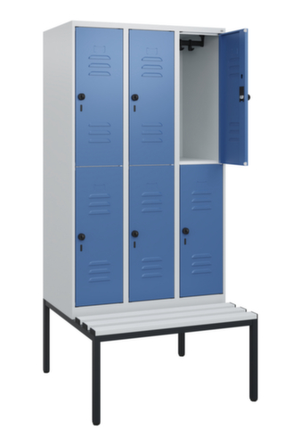 Les principales dimensions de C+P l’armoire vestiaire Classic Plus en un coup d’œil :par compartiment 2 casiers avec chacun 1 tringle et 3 doubles crochets coulissants anti-torsion. porte battante avec porte-étiquette et fentes d’aération. Les gonds intérieurs des portes battantes offrent l’avantage d’un visuel net, car aucune vis ou charnière n’est visible de l’extérieur. Le design de l’armoire n’est donc pas altéré et l’ensemble du meuble semble de meilleure qualité. La surface lisse est également plus facile à nettoyer, car aucun dépôt de saleté ou de poussière n’est à craindre aux endroits inaccessibles. Chaque porte est équipée de série d’un amortisseur, de sorte que, même fermée avec élan, elle ne claque pas. Cela contribue non seulement à améliorer l’environnement sonore, mais protège aussi l’armoire en acier des dommages. La structure BIONIC Steel Frame, inspirée de la nature, est une construction particulièrement efficace et stable. La structure interne raffinée composée de pliages, d’entretoises et d’espaces, ainsi que la plus grande épaisseur de matériau aux endroits cruciaux, comme à l’avant des parois latérales et dans les profilés de cloisons et de caissons, augmentent encore la rigidité. Verrouillable avec Porte-cadenas de sécurité pour cadenas. La serrure de sécurité est particulièrement résistante aux effractions puisqu’elle tourne en position verrouillée et se verrouille uniquement après le retrait de la serrure. Convient pour tous les cadenas avec une épaisseur d'anse de 6 - 8 mm. Les orifices de ventilation supplémentaires dans le compartiment, combinés aux fentes d’aération dans la porte, améliorent le flux d’air. L’intérieur de l’armoire est ainsi mieux ventilé et son contenu sèche plus vite, sans générer de mauvaises odeurs. Le banc intégré assure une utilisation efficace de l'espace disponible. Il permet de s'habiller et de se déshabiller facilement et offre un espace de rangement supplémentaire sans prendre de place. Les lames sont en plastique. structure en acier, soudé de manière stable. Cela rend la structure particulièrement robuste et résistante, et donc plus durable. Les coins et les angles soudés du corps garantissent une plus grande étanchéité et donc une meilleure protection contre la poussière, l’humidité et la saleté qu’une structure vissée. En outre, il n’est pas nécessaire de procéder à des travaux d’entretien réguliers ni à des réajustements. corps avec thermolaquage en RAL7035 gris clair, face avant avec thermolaquage en RAL5023 bleu distant.