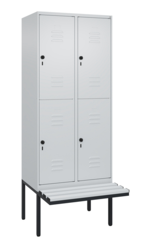 Les principales dimensions de C+P l’armoire vestiaire Classic Plus en un coup d’œil :par compartiment 2 casiers avec chacun 1 tringle et 3 doubles crochets coulissants anti-torsion. porte battante avec porte-étiquette et fentes d’aération. Les gonds intérieurs des portes battantes offrent l’avantage d’un visuel net, car aucune vis ou charnière n’est visible de l’extérieur. Le design de l’armoire n’est donc pas altéré et l’ensemble du meuble semble de meilleure qualité. La surface lisse est également plus facile à nettoyer, car aucun dépôt de saleté ou de poussière n’est à craindre aux endroits inaccessibles. Chaque porte est équipée de série d’un amortisseur, de sorte que, même fermée avec élan, elle ne claque pas. Cela contribue non seulement à améliorer l’environnement sonore, mais protège aussi l’armoire en acier des dommages. La structure BIONIC Steel Frame, inspirée de la nature, est une construction particulièrement efficace et stable. La structure interne raffinée composée de pliages, d’entretoises et d’espaces, ainsi que la plus grande épaisseur de matériau aux endroits cruciaux, comme à l’avant des parois latérales et dans les profilés de cloisons et de caissons, augmentent encore la rigidité. Verrouillable avec Porte-cadenas de sécurité pour cadenas. La serrure de sécurité est particulièrement résistante aux effractions puisqu’elle tourne en position verrouillée et se verrouille uniquement après le retrait de la serrure. Convient pour tous les cadenas avec une épaisseur d'anse de 6 - 8 mm. Les orifices de ventilation supplémentaires dans le compartiment, combinés aux fentes d’aération dans la porte, améliorent le flux d’air. L’intérieur de l’armoire est ainsi mieux ventilé et son contenu sèche plus vite, sans générer de mauvaises odeurs. Le banc suspendu offre plus d'espace libre pour s'habiller et se déshabiller confortablement, sans être gêné par le piètement. Les lames sont en plastique. structure en acier, soudé de manière stable. Cela rend la structure particulièrement robuste et résistante, et donc plus durable. Les coins et les angles soudés du corps garantissent une plus grande étanchéité et donc une meilleure protection contre la poussière, l’humidité et la saleté qu’une structure vissée. En outre, il n’est pas nécessaire de procéder à des travaux d’entretien réguliers ni à des réajustements. corps avec thermolaquage en RAL7035 gris clair, face avant avec thermolaquage en RAL7035 gris clair.