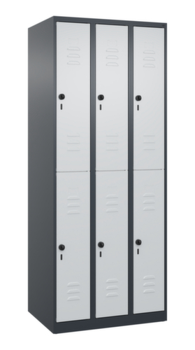 Les principales dimensions de C+P l’armoire vestiaire Classic Plus en un coup d’œil :par compartiment 2 casiers avec chacun 1 tringle et 3 doubles crochets coulissants anti-torsion. porte battante avec porte-étiquette et fentes d’aération. Les gonds intérieurs des portes battantes offrent l’avantage d’un visuel net, car aucune vis ou charnière n’est visible de l’extérieur. Le design de l’armoire n’est donc pas altéré et l’ensemble du meuble semble de meilleure qualité. La surface lisse est également plus facile à nettoyer, car aucun dépôt de saleté ou de poussière n’est à craindre aux endroits inaccessibles. Chaque porte est équipée de série d’un amortisseur, de sorte que, même fermée avec élan, elle ne claque pas. Cela contribue non seulement à améliorer l’environnement sonore, mais protège aussi l’armoire en acier des dommages. La structure BIONIC Steel Frame, inspirée de la nature, est une construction particulièrement efficace et stable. La structure interne raffinée composée de pliages, d’entretoises et d’espaces, ainsi que la plus grande épaisseur de matériau aux endroits cruciaux, comme à l’avant des parois latérales et dans les profilés de cloisons et de caissons, augmentent encore la rigidité. Verrouillable avec Porte-cadenas de sécurité pour cadenas. La serrure de sécurité est particulièrement résistante aux effractions puisqu’elle tourne en position verrouillée et se verrouille uniquement après le retrait de la serrure. Convient pour tous les cadenas avec une épaisseur d'anse de 6 - 8 mm. Les orifices de ventilation supplémentaires dans le compartiment, combinés aux fentes d’aération dans la porte, améliorent le flux d’air. L’intérieur de l’armoire est ainsi mieux ventilé et son contenu sèche plus vite, sans générer de mauvaises odeurs. Pour une apparence fine et un gain de place, l’armoire se pose directement au sol sans socle ni pieds. Des vis de mise à niveau assurent une pose sans vacillement en cas d’éventuelles irrégularités du sol. Le fond de l’armoire est galvanisé pour une protection anticorrosion améliorée. structure en acier, soudé de manière stable. Cela rend la structure particulièrement robuste et résistante, et donc plus durable. Les coins et les angles soudés du corps garantissent une plus grande étanchéité et donc une meilleure protection contre la poussière, l’humidité et la saleté qu’une structure vissée. En outre, il n’est pas nécessaire de procéder à des travaux d’entretien réguliers ni à des réajustements. corps avec thermolaquage en RAL7016 gris anthracite, face avant avec thermolaquage en RAL7035 gris clair.