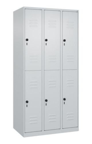 Les principales dimensions de C+P l’armoire vestiaire Classic Plus en un coup d’œil :par compartiment 2 casiers avec chacun 1 tringle et 3 doubles crochets coulissants anti-torsion. porte battante avec porte-étiquette et fentes d’aération. Les gonds intérieurs des portes battantes offrent l’avantage d’un visuel net, car aucune vis ou charnière n’est visible de l’extérieur. Le design de l’armoire n’est donc pas altéré et l’ensemble du meuble semble de meilleure qualité. La surface lisse est également plus facile à nettoyer, car aucun dépôt de saleté ou de poussière n’est à craindre aux endroits inaccessibles. Chaque porte est équipée de série d’un amortisseur, de sorte que, même fermée avec élan, elle ne claque pas. Cela contribue non seulement à améliorer l’environnement sonore, mais protège aussi l’armoire en acier des dommages. La structure BIONIC Steel Frame, inspirée de la nature, est une construction particulièrement efficace et stable. La structure interne raffinée composée de pliages, d’entretoises et d’espaces, ainsi que la plus grande épaisseur de matériau aux endroits cruciaux, comme à l’avant des parois latérales et dans les profilés de cloisons et de caissons, augmentent encore la rigidité. Verrouillable avec Porte-cadenas de sécurité pour cadenas. La serrure de sécurité est particulièrement résistante aux effractions puisqu’elle tourne en position verrouillée et se verrouille uniquement après le retrait de la serrure. Convient pour tous les cadenas avec une épaisseur d'anse de 6 - 8 mm. Les orifices de ventilation supplémentaires dans le compartiment, combinés aux fentes d’aération dans la porte, améliorent le flux d’air. L’intérieur de l’armoire est ainsi mieux ventilé et son contenu sèche plus vite, sans générer de mauvaises odeurs. Pour une apparence fine et un gain de place, l’armoire se pose directement au sol sans socle ni pieds. Des vis de mise à niveau assurent une pose sans vacillement en cas d’éventuelles irrégularités du sol. Le fond de l’armoire est galvanisé pour une protection anticorrosion améliorée. structure en acier, soudé de manière stable. Cela rend la structure particulièrement robuste et résistante, et donc plus durable. Les coins et les angles soudés du corps garantissent une plus grande étanchéité et donc une meilleure protection contre la poussière, l’humidité et la saleté qu’une structure vissée. En outre, il n’est pas nécessaire de procéder à des travaux d’entretien réguliers ni à des réajustements. corps avec thermolaquage en RAL7035 gris clair, face avant avec thermolaquage en RAL7035 gris clair.