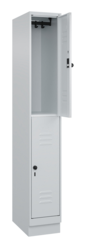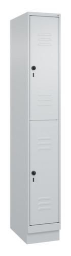 Les principales dimensions de C+P l’armoire vestiaire Classic Plus en un coup d’œil :par compartiment 2 casiers avec chacun 1 tringle et 3 doubles crochets coulissants anti-torsion. porte battante avec porte-étiquette et fentes d’aération. Les gonds intérieurs des portes battantes offrent l’avantage d’un visuel net, car aucune vis ou charnière n’est visible de l’extérieur. Le design de l’armoire n’est donc pas altéré et l’ensemble du meuble semble de meilleure qualité. La surface lisse est également plus facile à nettoyer, car aucun dépôt de saleté ou de poussière n’est à craindre aux endroits inaccessibles. Chaque porte est équipée de série d’un amortisseur, de sorte que, même fermée avec élan, elle ne claque pas. Cela contribue non seulement à améliorer l’environnement sonore, mais protège aussi l’armoire en acier des dommages. La structure BIONIC Steel Frame, inspirée de la nature, est une construction particulièrement efficace et stable. La structure interne raffinée composée de pliages, d’entretoises et d’espaces, ainsi que la plus grande épaisseur de matériau aux endroits cruciaux, comme à l’avant des parois latérales et dans les profilés de cloisons et de caissons, augmentent encore la rigidité. Verrouillable avec Porte-cadenas de sécurité pour cadenas. La serrure de sécurité est particulièrement résistante aux effractions puisqu’elle tourne en position verrouillée et se verrouille uniquement après le retrait de la serrure. Convient pour tous les cadenas avec une épaisseur d'anse de 6 - 8 mm. Les orifices de ventilation supplémentaires dans le compartiment, combinés aux fentes d’aération dans la porte, améliorent le flux d’air. L’intérieur de l’armoire est ainsi mieux ventilé et son contenu sèche plus vite, sans générer de mauvaises odeurs. Le socle encastré permet de répartir uniformément le poids de l’armoire sur le sol. Cela augmente la stabilité et l’armoire peut supporter des charges plus lourdes qu’une armoire à pieds. De plus, la saleté, la poussière et l’humidité ne peuvent pas s’infiltrer sous l’armoire, ce qui réduit la surface de nettoyage. structure en acier, soudé de manière stable. Cela rend la structure particulièrement robuste et résistante, et donc plus durable. Les coins et les angles soudés du corps garantissent une plus grande étanchéité et donc une meilleure protection contre la poussière, l’humidité et la saleté qu’une structure vissée. En outre, il n’est pas nécessaire de procéder à des travaux d’entretien réguliers ni à des réajustements. corps avec thermolaquage en RAL7035 gris clair, face avant avec thermolaquage en RAL7035 gris clair.