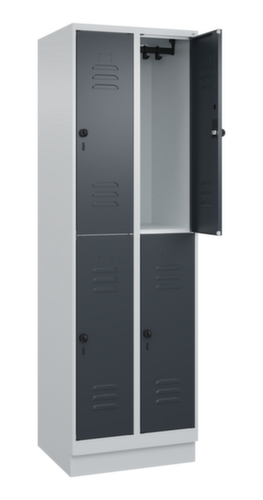 Les principales dimensions de C+P l’armoire vestiaire Classic Plus en un coup d’œil :par compartiment 2 casiers avec chacun 1 tringle et 3 doubles crochets coulissants anti-torsion. porte battante avec porte-étiquette et fentes d’aération. Les gonds intérieurs des portes battantes offrent l’avantage d’un visuel net, car aucune vis ou charnière n’est visible de l’extérieur. Le design de l’armoire n’est donc pas altéré et l’ensemble du meuble semble de meilleure qualité. La surface lisse est également plus facile à nettoyer, car aucun dépôt de saleté ou de poussière n’est à craindre aux endroits inaccessibles. Chaque porte est équipée de série d’un amortisseur, de sorte que, même fermée avec élan, elle ne claque pas. Cela contribue non seulement à améliorer l’environnement sonore, mais protège aussi l’armoire en acier des dommages. La structure BIONIC Steel Frame, inspirée de la nature, est une construction particulièrement efficace et stable. La structure interne raffinée composée de pliages, d’entretoises et d’espaces, ainsi que la plus grande épaisseur de matériau aux endroits cruciaux, comme à l’avant des parois latérales et dans les profilés de cloisons et de caissons, augmentent encore la rigidité. Verrouillable avec Porte-cadenas de sécurité pour cadenas. La serrure de sécurité est particulièrement résistante aux effractions puisqu’elle tourne en position verrouillée et se verrouille uniquement après le retrait de la serrure. Convient pour tous les cadenas avec une épaisseur d'anse de 6 - 8 mm. Les orifices de ventilation supplémentaires dans le compartiment, combinés aux fentes d’aération dans la porte, améliorent le flux d’air. L’intérieur de l’armoire est ainsi mieux ventilé et son contenu sèche plus vite, sans générer de mauvaises odeurs. Le socle encastré permet de répartir uniformément le poids de l’armoire sur le sol. Cela augmente la stabilité et l’armoire peut supporter des charges plus lourdes qu’une armoire à pieds. De plus, la saleté, la poussière et l’humidité ne peuvent pas s’infiltrer sous l’armoire, ce qui réduit la surface de nettoyage. structure en acier, soudé de manière stable. Cela rend la structure particulièrement robuste et résistante, et donc plus durable. Les coins et les angles soudés du corps garantissent une plus grande étanchéité et donc une meilleure protection contre la poussière, l’humidité et la saleté qu’une structure vissée. En outre, il n’est pas nécessaire de procéder à des travaux d’entretien réguliers ni à des réajustements. corps avec thermolaquage en RAL7035 gris clair, face avant avec thermolaquage en RAL7016 gris anthracite.