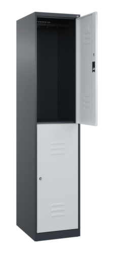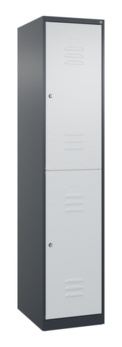 Les principales dimensions de C+P l’armoire vestiaire Classic Plus en un coup d’œil :par compartiment 2 casiers avec chacun 1 tringle et 3 doubles crochets coulissants anti-torsion. porte battante avec porte-étiquette et fentes d’aération. Les gonds intérieurs des portes battantes offrent l’avantage d’un visuel net, car aucune vis ou charnière n’est visible de l’extérieur. Le design de l’armoire n’est donc pas altéré et l’ensemble du meuble semble de meilleure qualité. La surface lisse est également plus facile à nettoyer, car aucun dépôt de saleté ou de poussière n’est à craindre aux endroits inaccessibles. Chaque porte est équipée de série d’un amortisseur, de sorte que, même fermée avec élan, elle ne claque pas. Cela contribue non seulement à améliorer l’environnement sonore, mais protège aussi l’armoire en acier des dommages. La structure BIONIC Steel Frame, inspirée de la nature, est une construction particulièrement efficace et stable. La structure interne raffinée composée de pliages, d’entretoises et d’espaces, ainsi que la plus grande épaisseur de matériau aux endroits cruciaux, comme à l’avant des parois latérales et dans les profilés de cloisons et de caissons, augmentent encore la rigidité. verrouillable avec serrure à cylindre. Les orifices de ventilation supplémentaires dans le compartiment, combinés aux fentes d’aération dans la porte, améliorent le flux d’air. L’intérieur de l’armoire est ainsi mieux ventilé et son contenu sèche plus vite, sans générer de mauvaises odeurs. Pour une apparence fine et un gain de place, l’armoire se pose directement au sol sans socle ni pieds. Des vis de mise à niveau assurent une pose sans vacillement en cas d’éventuelles irrégularités du sol. Le fond de l’armoire est galvanisé pour une protection anticorrosion améliorée. structure en acier, soudé de manière stable. Cela rend la structure particulièrement robuste et résistante, et donc plus durable. Les coins et les angles soudés du corps garantissent une plus grande étanchéité et donc une meilleure protection contre la poussière, l’humidité et la saleté qu’une structure vissée. En outre, il n’est pas nécessaire de procéder à des travaux d’entretien réguliers ni à des réajustements. corps avec thermolaquage en RAL7016 gris anthracite, face avant avec thermolaquage en RAL7035 gris clair.