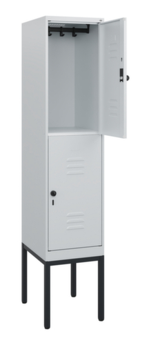 Les principales dimensions de C+P l’armoire vestiaire Classic Plus en un coup d’œil :par compartiment 2 casiers avec chacun 1 tringle et 3 doubles crochets coulissants anti-torsion. porte battante avec porte-étiquette et fentes d’aération. Les gonds intérieurs des portes battantes offrent l’avantage d’un visuel net, car aucune vis ou charnière n’est visible de l’extérieur. Le design de l’armoire n’est donc pas altéré et l’ensemble du meuble semble de meilleure qualité. La surface lisse est également plus facile à nettoyer, car aucun dépôt de saleté ou de poussière n’est à craindre aux endroits inaccessibles. Chaque porte est équipée de série d’un amortisseur, de sorte que, même fermée avec élan, elle ne claque pas. Cela contribue non seulement à améliorer l’environnement sonore, mais protège aussi l’armoire en acier des dommages. La structure BIONIC Steel Frame, inspirée de la nature, est une construction particulièrement efficace et stable. La structure interne raffinée composée de pliages, d’entretoises et d’espaces, ainsi que la plus grande épaisseur de matériau aux endroits cruciaux, comme à l’avant des parois latérales et dans les profilés de cloisons et de caissons, augmentent encore la rigidité. Verrouillable avec Porte-cadenas de sécurité pour cadenas. La serrure de sécurité est particulièrement résistante aux effractions puisqu’elle tourne en position verrouillée et se verrouille uniquement après le retrait de la serrure. Convient pour tous les cadenas avec une épaisseur d'anse de 6 - 8 mm. Les orifices de ventilation supplémentaires dans le compartiment, combinés aux fentes d’aération dans la porte, améliorent le flux d’air. L’intérieur de l’armoire est ainsi mieux ventilé et son contenu sèche plus vite, sans générer de mauvaises odeurs. Le piètement intégré réduit l'accumulation possible de la poussière et de la saleté en facilitant le nettoyage de toute la surface. Crée en plus un espace de rangement supplémentaire sous l'armoire. Les chaussures et les sacs ne sont plus dans le passage, et le risque de trébuchement est minimisé. structure en acier, soudé de manière stable. Cela rend la structure particulièrement robuste et résistante, et donc plus durable. Les coins et les angles soudés du corps garantissent une plus grande étanchéité et donc une meilleure protection contre la poussière, l’humidité et la saleté qu’une structure vissée. En outre, il n’est pas nécessaire de procéder à des travaux d’entretien réguliers ni à des réajustements. corps avec thermolaquage en RAL7035 gris clair, face avant avec thermolaquage en RAL7035 gris clair.