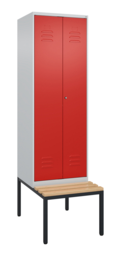 Les principales dimensions de C+P l’armoire vestiaire Classic Plus en un coup d’œil :par compartiment une tablette à chapeaux soudée au-dessus d’une tringle avec 3 doubles crochets coulissants anti-torsion. porte à double battant avec fentes d’aération et porte-étiquette. Les gonds intérieurs des portes battantes offrent l’avantage d’un visuel net, car aucune vis ou charnière n’est visible de l’extérieur. Le design de l’armoire n’est donc pas altéré et l’ensemble du meuble semble de meilleure qualité. La surface lisse est également plus facile à nettoyer, car aucun dépôt de saleté ou de poussière n’est à craindre aux endroits inaccessibles. Chaque porte est équipée de série d’un amortisseur, de sorte que, même fermée avec élan, elle ne claque pas. Cela contribue non seulement à améliorer l’environnement sonore, mais protège aussi l’armoire en acier des dommages. La structure BIONIC Steel Frame, inspirée de la nature, est une construction particulièrement efficace et stable. La structure interne raffinée composée de pliages, d’entretoises et d’espaces, ainsi que la plus grande épaisseur de matériau aux endroits cruciaux, comme à l’avant des parois latérales et dans les profilés de cloisons et de caissons, augmentent encore la rigidité. verrouillable avec serrure à cylindre. Chaque personne dispose de 2 compartiments qui peuvent être verrouillés ensemble via des portes convergentes. Cela permet de séparer de manière simple et efficace les vêtements de travail et ceux de tous les jours. Les orifices de ventilation supplémentaires dans le compartiment, combinés aux fentes d’aération dans la porte, améliorent le flux d’air. L’intérieur de l’armoire est ainsi mieux ventilé et son contenu sèche plus vite, sans générer de mauvaises odeurs. Le banc intégré assure une utilisation efficace de l'espace disponible. Il permet de s'habiller et de se déshabiller facilement et offre un espace de rangement supplémentaire sans prendre de place. Les lames sont en bois de hêtre. structure en acier, soudé de manière stable. Cela rend la structure particulièrement robuste et résistante, et donc plus durable. Les coins et les angles soudés du corps garantissent une plus grande étanchéité et donc une meilleure protection contre la poussière, l’humidité et la saleté qu’une structure vissée. En outre, il n’est pas nécessaire de procéder à des travaux d’entretien réguliers ni à des réajustements. corps avec thermolaquage en RAL7035 gris clair, face avant avec thermolaquage en RAL3020 rouge signalisation.