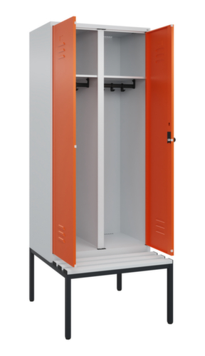 Les principales dimensions de C+P l’armoire vestiaire Classic Plus en un coup d’œil :par compartiment une tablette à chapeaux soudée au-dessus d’une tringle avec 3 doubles crochets coulissants anti-torsion. porte à double battant avec fentes d’aération et porte-étiquette. Les gonds intérieurs des portes battantes offrent l’avantage d’un visuel net, car aucune vis ou charnière n’est visible de l’extérieur. Le design de l’armoire n’est donc pas altéré et l’ensemble du meuble semble de meilleure qualité. La surface lisse est également plus facile à nettoyer, car aucun dépôt de saleté ou de poussière n’est à craindre aux endroits inaccessibles. Chaque porte est équipée de série d’un amortisseur, de sorte que, même fermée avec élan, elle ne claque pas. Cela contribue non seulement à améliorer l’environnement sonore, mais protège aussi l’armoire en acier des dommages. La structure BIONIC Steel Frame, inspirée de la nature, est une construction particulièrement efficace et stable. La structure interne raffinée composée de pliages, d’entretoises et d’espaces, ainsi que la plus grande épaisseur de matériau aux endroits cruciaux, comme à l’avant des parois latérales et dans les profilés de cloisons et de caissons, augmentent encore la rigidité. Verrouillable avec Porte-cadenas de sécurité pour cadenas. La serrure de sécurité est particulièrement résistante aux effractions puisqu’elle tourne en position verrouillée et se verrouille uniquement après le retrait de la serrure. Convient pour tous les cadenas avec une épaisseur d'anse de 6 - 8 mm. Chaque personne dispose de 2 compartiments qui peuvent être verrouillés ensemble via des portes convergentes. Cela permet de séparer de manière simple et efficace les vêtements de travail et ceux de tous les jours. Les orifices de ventilation supplémentaires dans le compartiment, combinés aux fentes d’aération dans la porte, améliorent le flux d’air. L’intérieur de l’armoire est ainsi mieux ventilé et son contenu sèche plus vite, sans générer de mauvaises odeurs. Le banc intégré assure une utilisation efficace de l'espace disponible. Il permet de s'habiller et de se déshabiller facilement et offre un espace de rangement supplémentaire sans prendre de place. Les lames sont en plastique. structure en acier, soudé de manière stable. Cela rend la structure particulièrement robuste et résistante, et donc plus durable. Les coins et les angles soudés du corps garantissent une plus grande étanchéité et donc une meilleure protection contre la poussière, l’humidité et la saleté qu’une structure vissée. En outre, il n’est pas nécessaire de procéder à des travaux d’entretien réguliers ni à des réajustements. corps avec thermolaquage en RAL7035 gris clair, face avant avec thermolaquage en RAL2004 orangé pur.