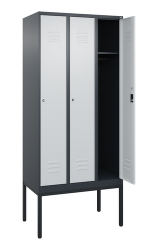 Les principales dimensions de C+P l’armoire vestiaire Classic Plus en un coup d’œil :par compartiment une tablette à chapeaux soudée au-dessus d’une tringle avec 3 doubles crochets coulissants anti-torsion. porte battante avec porte-étiquette et fentes d’aération. Les gonds intérieurs des portes battantes offrent l’avantage d’un visuel net, car aucune vis ou charnière n’est visible de l’extérieur. Le design de l’armoire n’est donc pas altéré et l’ensemble du meuble semble de meilleure qualité. La surface lisse est également plus facile à nettoyer, car aucun dépôt de saleté ou de poussière n’est à craindre aux endroits inaccessibles. Chaque porte est équipée de série d’un amortisseur, de sorte que, même fermée avec élan, elle ne claque pas. Cela contribue non seulement à améliorer l’environnement sonore, mais protège aussi l’armoire en acier des dommages. La structure BIONIC Steel Frame, inspirée de la nature, est une construction particulièrement efficace et stable. La structure interne raffinée composée de pliages, d’entretoises et d’espaces, ainsi que la plus grande épaisseur de matériau aux endroits cruciaux, comme à l’avant des parois latérales et dans les profilés de cloisons et de caissons, augmentent encore la rigidité. verrouillable avec serrure à cylindre. Les orifices de ventilation supplémentaires dans le compartiment, combinés aux fentes d’aération dans la porte, améliorent le flux d’air. L’intérieur de l’armoire est ainsi mieux ventilé et son contenu sèche plus vite, sans générer de mauvaises odeurs. Le piètement intégré réduit l'accumulation possible de la poussière et de la saleté en facilitant le nettoyage de toute la surface. Crée en plus un espace de rangement supplémentaire sous l'armoire. Les chaussures et les sacs ne sont plus dans le passage, et le risque de trébuchement est minimisé. structure en acier, soudé de manière stable. Cela rend la structure particulièrement robuste et résistante, et donc plus durable. Les coins et les angles soudés du corps garantissent une plus grande étanchéité et donc une meilleure protection contre la poussière, l’humidité et la saleté qu’une structure vissée. En outre, il n’est pas nécessaire de procéder à des travaux d’entretien réguliers ni à des réajustements. corps avec thermolaquage en RAL7016 gris anthracite, face avant avec thermolaquage en RAL7035 gris clair.