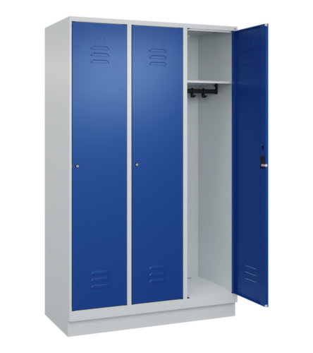 Les principales dimensions de C+P l’armoire vestiaire Classic Plus en un coup d’œil :par compartiment une tablette à chapeaux soudée au-dessus d’une tringle avec 3 doubles crochets coulissants anti-torsion. porte battante avec porte-étiquette et fentes d’aération. Les gonds intérieurs des portes battantes offrent l’avantage d’un visuel net, car aucune vis ou charnière n’est visible de l’extérieur. Le design de l’armoire n’est donc pas altéré et l’ensemble du meuble semble de meilleure qualité. La surface lisse est également plus facile à nettoyer, car aucun dépôt de saleté ou de poussière n’est à craindre aux endroits inaccessibles. Chaque porte est équipée de série d’un amortisseur, de sorte que, même fermée avec élan, elle ne claque pas. Cela contribue non seulement à améliorer l’environnement sonore, mais protège aussi l’armoire en acier des dommages. La structure BIONIC Steel Frame, inspirée de la nature, est une construction particulièrement efficace et stable. La structure interne raffinée composée de pliages, d’entretoises et d’espaces, ainsi que la plus grande épaisseur de matériau aux endroits cruciaux, comme à l’avant des parois latérales et dans les profilés de cloisons et de caissons, augmentent encore la rigidité. verrouillable avec serrure à cylindre. Les orifices de ventilation supplémentaires dans le compartiment, combinés aux fentes d’aération dans la porte, améliorent le flux d’air. L’intérieur de l’armoire est ainsi mieux ventilé et son contenu sèche plus vite, sans générer de mauvaises odeurs. Le socle encastré permet de répartir uniformément le poids de l’armoire sur le sol. Cela augmente la stabilité et l’armoire peut supporter des charges plus lourdes qu’une armoire à pieds. De plus, la saleté, la poussière et l’humidité ne peuvent pas s’infiltrer sous l’armoire, ce qui réduit la surface de nettoyage. structure en acier, soudé de manière stable. Cela rend la structure particulièrement robuste et résistante, et donc plus durable. Les coins et les angles soudés du corps garantissent une plus grande étanchéité et donc une meilleure protection contre la poussière, l’humidité et la saleté qu’une structure vissée. En outre, il n’est pas nécessaire de procéder à des travaux d’entretien réguliers ni à des réajustements. corps avec thermolaquage en RAL7035 gris clair, face avant avec thermolaquage en RAL5010 bleu gentiane.