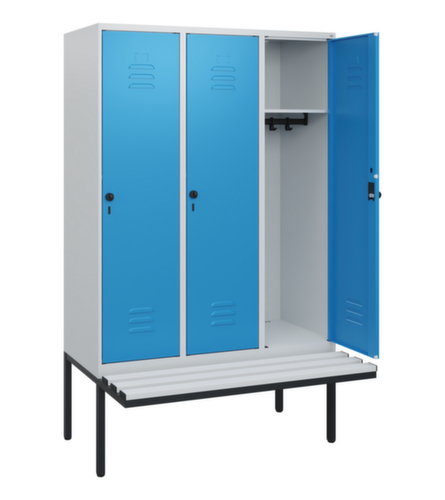 Les principales dimensions de C+P l’armoire vestiaire Classic Plus en un coup d’œil :par compartiment une tablette à chapeaux soudée au-dessus d’une tringle avec 3 doubles crochets coulissants anti-torsion. porte battante avec porte-étiquette et fentes d’aération. Les gonds intérieurs des portes battantes offrent l’avantage d’un visuel net, car aucune vis ou charnière n’est visible de l’extérieur. Le design de l’armoire n’est donc pas altéré et l’ensemble du meuble semble de meilleure qualité. La surface lisse est également plus facile à nettoyer, car aucun dépôt de saleté ou de poussière n’est à craindre aux endroits inaccessibles. Chaque porte est équipée de série d’un amortisseur, de sorte que, même fermée avec élan, elle ne claque pas. Cela contribue non seulement à améliorer l’environnement sonore, mais protège aussi l’armoire en acier des dommages. La structure BIONIC Steel Frame, inspirée de la nature, est une construction particulièrement efficace et stable. La structure interne raffinée composée de pliages, d’entretoises et d’espaces, ainsi que la plus grande épaisseur de matériau aux endroits cruciaux, comme à l’avant des parois latérales et dans les profilés de cloisons et de caissons, augmentent encore la rigidité. Verrouillable avec Porte-cadenas de sécurité pour cadenas. La serrure de sécurité est particulièrement résistante aux effractions puisqu’elle tourne en position verrouillée et se verrouille uniquement après le retrait de la serrure. Convient pour tous les cadenas avec une épaisseur d'anse de 6 - 8 mm. Les orifices de ventilation supplémentaires dans le compartiment, combinés aux fentes d’aération dans la porte, améliorent le flux d’air. L’intérieur de l’armoire est ainsi mieux ventilé et son contenu sèche plus vite, sans générer de mauvaises odeurs. Le banc suspendu offre plus d'espace libre pour s'habiller et se déshabiller confortablement, sans être gêné par le piètement. Les lames sont en plastique. Le piètement intégré réduit l'accumulation possible de la poussière et de la saleté en facilitant le nettoyage de toute la surface. Crée en plus un espace de rangement supplémentaire sous l'armoire. Les chaussures et les sacs ne sont plus dans le passage, et le risque de trébuchement est minimisé. structure en acier, soudé de manière stable. Cela rend la structure particulièrement robuste et résistante, et donc plus durable. Les coins et les angles soudés du corps garantissent une plus grande étanchéité et donc une meilleure protection contre la poussière, l’humidité et la saleté qu’une structure vissée. En outre, il n’est pas nécessaire de procéder à des travaux d’entretien réguliers ni à des réajustements. corps avec thermolaquage en RAL7035 gris clair, face avant avec thermolaquage en RAL 5012 bleu clair.