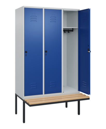 Les principales dimensions de C+P l’armoire vestiaire Classic Plus en un coup d’œil :par compartiment une tablette à chapeaux soudée au-dessus d’une tringle avec 3 doubles crochets coulissants anti-torsion. porte battante avec porte-étiquette et fentes d’aération. Les gonds intérieurs des portes battantes offrent l’avantage d’un visuel net, car aucune vis ou charnière n’est visible de l’extérieur. Le design de l’armoire n’est donc pas altéré et l’ensemble du meuble semble de meilleure qualité. La surface lisse est également plus facile à nettoyer, car aucun dépôt de saleté ou de poussière n’est à craindre aux endroits inaccessibles. Chaque porte est équipée de série d’un amortisseur, de sorte que, même fermée avec élan, elle ne claque pas. Cela contribue non seulement à améliorer l’environnement sonore, mais protège aussi l’armoire en acier des dommages. La structure BIONIC Steel Frame, inspirée de la nature, est une construction particulièrement efficace et stable. La structure interne raffinée composée de pliages, d’entretoises et d’espaces, ainsi que la plus grande épaisseur de matériau aux endroits cruciaux, comme à l’avant des parois latérales et dans les profilés de cloisons et de caissons, augmentent encore la rigidité. Verrouillable avec Porte-cadenas de sécurité pour cadenas. La serrure de sécurité est particulièrement résistante aux effractions puisqu’elle tourne en position verrouillée et se verrouille uniquement après le retrait de la serrure. Convient pour tous les cadenas avec une épaisseur d'anse de 6 - 8 mm. Les orifices de ventilation supplémentaires dans le compartiment, combinés aux fentes d’aération dans la porte, améliorent le flux d’air. L’intérieur de l’armoire est ainsi mieux ventilé et son contenu sèche plus vite, sans générer de mauvaises odeurs. Le banc suspendu offre plus d'espace libre pour s'habiller et se déshabiller confortablement, sans être gêné par le piètement. Les lames sont en bois de hêtre. Le piètement intégré réduit l'accumulation possible de la poussière et de la saleté en facilitant le nettoyage de toute la surface. Crée en plus un espace de rangement supplémentaire sous l'armoire. Les chaussures et les sacs ne sont plus dans le passage, et le risque de trébuchement est minimisé. structure en acier, soudé de manière stable. Cela rend la structure particulièrement robuste et résistante, et donc plus durable. Les coins et les angles soudés du corps garantissent une plus grande étanchéité et donc une meilleure protection contre la poussière, l’humidité et la saleté qu’une structure vissée. En outre, il n’est pas nécessaire de procéder à des travaux d’entretien réguliers ni à des réajustements. corps avec thermolaquage en RAL7035 gris clair, face avant avec thermolaquage en RAL5010 bleu gentiane.
