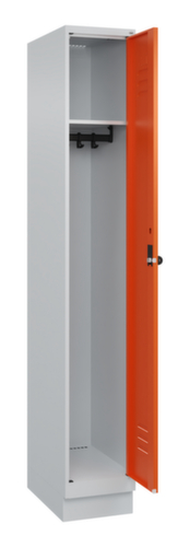 Les principales dimensions de C+P l’armoire vestiaire Classic Plus en un coup d’œil :par compartiment une tablette à chapeaux soudée au-dessus d’une tringle avec 3 doubles crochets coulissants anti-torsion. porte battante avec porte-étiquette et fentes d’aération. Les gonds intérieurs des portes battantes offrent l’avantage d’un visuel net, car aucune vis ou charnière n’est visible de l’extérieur. Le design de l’armoire n’est donc pas altéré et l’ensemble du meuble semble de meilleure qualité. La surface lisse est également plus facile à nettoyer, car aucun dépôt de saleté ou de poussière n’est à craindre aux endroits inaccessibles. Chaque porte est équipée de série d’un amortisseur, de sorte que, même fermée avec élan, elle ne claque pas. Cela contribue non seulement à améliorer l’environnement sonore, mais protège aussi l’armoire en acier des dommages. La structure BIONIC Steel Frame, inspirée de la nature, est une construction particulièrement efficace et stable. La structure interne raffinée composée de pliages, d’entretoises et d’espaces, ainsi que la plus grande épaisseur de matériau aux endroits cruciaux, comme à l’avant des parois latérales et dans les profilés de cloisons et de caissons, augmentent encore la rigidité. Verrouillable avec Porte-cadenas de sécurité pour cadenas. La serrure de sécurité est particulièrement résistante aux effractions puisqu’elle tourne en position verrouillée et se verrouille uniquement après le retrait de la serrure. Convient pour tous les cadenas avec une épaisseur d'anse de 6 - 8 mm. Les orifices de ventilation supplémentaires dans le compartiment, combinés aux fentes d’aération dans la porte, améliorent le flux d’air. L’intérieur de l’armoire est ainsi mieux ventilé et son contenu sèche plus vite, sans générer de mauvaises odeurs. Le socle encastré permet de répartir uniformément le poids de l’armoire sur le sol. Cela augmente la stabilité et l’armoire peut supporter des charges plus lourdes qu’une armoire à pieds. De plus, la saleté, la poussière et l’humidité ne peuvent pas s’infiltrer sous l’armoire, ce qui réduit la surface de nettoyage. structure en acier, soudé de manière stable. Cela rend la structure particulièrement robuste et résistante, et donc plus durable. Les coins et les angles soudés du corps garantissent une plus grande étanchéité et donc une meilleure protection contre la poussière, l’humidité et la saleté qu’une structure vissée. En outre, il n’est pas nécessaire de procéder à des travaux d’entretien réguliers ni à des réajustements. corps avec thermolaquage en RAL7035 gris clair, face avant avec thermolaquage en RAL2004 orangé pur.