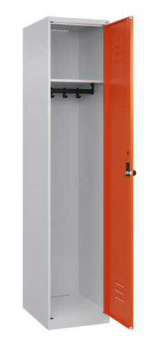 Les principales dimensions de C+P l’armoire vestiaire Classic Plus en un coup d’œil :par compartiment une tablette à chapeaux soudée au-dessus d’une tringle avec 3 doubles crochets coulissants anti-torsion. porte battante avec porte-étiquette et fentes d’aération. Les gonds intérieurs des portes battantes offrent l’avantage d’un visuel net, car aucune vis ou charnière n’est visible de l’extérieur. Le design de l’armoire n’est donc pas altéré et l’ensemble du meuble semble de meilleure qualité. La surface lisse est également plus facile à nettoyer, car aucun dépôt de saleté ou de poussière n’est à craindre aux endroits inaccessibles. Chaque porte est équipée de série d’un amortisseur, de sorte que, même fermée avec élan, elle ne claque pas. Cela contribue non seulement à améliorer l’environnement sonore, mais protège aussi l’armoire en acier des dommages. La structure BIONIC Steel Frame, inspirée de la nature, est une construction particulièrement efficace et stable. La structure interne raffinée composée de pliages, d’entretoises et d’espaces, ainsi que la plus grande épaisseur de matériau aux endroits cruciaux, comme à l’avant des parois latérales et dans les profilés de cloisons et de caissons, augmentent encore la rigidité. Verrouillable avec Porte-cadenas de sécurité pour cadenas. La serrure de sécurité est particulièrement résistante aux effractions puisqu’elle tourne en position verrouillée et se verrouille uniquement après le retrait de la serrure. Convient pour tous les cadenas avec une épaisseur d'anse de 6 - 8 mm. Les orifices de ventilation supplémentaires dans le compartiment, combinés aux fentes d’aération dans la porte, améliorent le flux d’air. L’intérieur de l’armoire est ainsi mieux ventilé et son contenu sèche plus vite, sans générer de mauvaises odeurs. Pour une apparence fine et un gain de place, l’armoire se pose directement au sol sans socle ni pieds. Des vis de mise à niveau assurent une pose sans vacillement en cas d’éventuelles irrégularités du sol. Le fond de l’armoire est galvanisé pour une protection anticorrosion améliorée. structure en acier, soudé de manière stable. Cela rend la structure particulièrement robuste et résistante, et donc plus durable. Les coins et les angles soudés du corps garantissent une plus grande étanchéité et donc une meilleure protection contre la poussière, l’humidité et la saleté qu’une structure vissée. En outre, il n’est pas nécessaire de procéder à des travaux d’entretien réguliers ni à des réajustements. corps avec thermolaquage en RAL7035 gris clair, face avant avec thermolaquage en RAL2004 orangé pur.