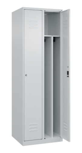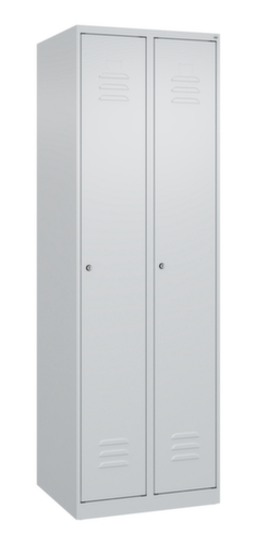 Les principales dimensions de C+P l’armoire vestiaire Classic Plus en un coup d’œil :par compartiment une tablette à chapeaux soudée au-dessus d’une tringle avec 3 doubles crochets coulissants anti-torsion. Le compartiment sous la tablette à chapeaux est divisé par une cloison de séparation médiane. Cela permet une séparation nette en noir et blanc des vêtements de travail et des vêtements de tous les jours. porte battante avec porte-étiquette et fentes d’aération. Les gonds intérieurs des portes battantes offrent l’avantage d’un visuel net, car aucune vis ou charnière n’est visible de l’extérieur. Le design de l’armoire n’est donc pas altéré et l’ensemble du meuble semble de meilleure qualité. La surface lisse est également plus facile à nettoyer, car aucun dépôt de saleté ou de poussière n’est à craindre aux endroits inaccessibles. Chaque porte est équipée de série d’un amortisseur, de sorte que, même fermée avec élan, elle ne claque pas. Cela contribue non seulement à améliorer l’environnement sonore, mais protège aussi l’armoire en acier des dommages. La structure BIONIC Steel Frame, inspirée de la nature, est une construction particulièrement efficace et stable. La structure interne raffinée composée de pliages, d’entretoises et d’espaces, ainsi que la plus grande épaisseur de matériau aux endroits cruciaux, comme à l’avant des parois latérales et dans les profilés de cloisons et de caissons, augmentent encore la rigidité. verrouillable avec serrure à cylindre. Les orifices de ventilation supplémentaires dans le compartiment, combinés aux fentes d’aération dans la porte, améliorent le flux d’air. L’intérieur de l’armoire est ainsi mieux ventilé et son contenu sèche plus vite, sans générer de mauvaises odeurs. Pour une apparence fine et un gain de place, l’armoire se pose directement au sol sans socle ni pieds. Des vis de mise à niveau assurent une pose sans vacillement en cas d’éventuelles irrégularités du sol. Le fond de l’armoire est galvanisé pour une protection anticorrosion améliorée. structure en acier, soudé de manière stable. Cela rend la structure particulièrement robuste et résistante, et donc plus durable. Les coins et les angles soudés du corps garantissent une plus grande étanchéité et donc une meilleure protection contre la poussière, l’humidité et la saleté qu’une structure vissée. En outre, il n’est pas nécessaire de procéder à des travaux d’entretien réguliers ni à des réajustements. corps avec thermolaquage en RAL7035 gris clair, face avant avec thermolaquage en RAL7035 gris clair.