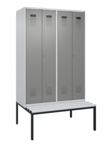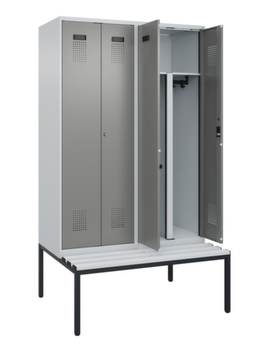 Les principales dimensions de C+P l’armoire vestiaire Evolo PLUS en un coup d’œil :par compartiment 1 tringle robuste à profil ovale avec 3 doubles crochets coulissants anti-torsion, au-dessus une tablette à chapeaux continue tous les 2 compartiments. Cette tablette extra large offre un espace de rangement idéal pour les EPI comme les casques, les protections oculaires ou auditives. Les double portes battantes peuvent être facilement personnalisées grâce au porte-étiquette pratique. Malgré la perforation décorative design qui est essentielle pour l'aération, l'armoire reste dans l'ensemble lisse, hygiénique et facile à nettoyer. Les gonds intérieurs des portes battantes offrent l’avantage d’un visuel net, car aucune vis ou charnière n’est visible de l’extérieur. Le design de l’armoire n’est donc pas altéré et l’ensemble du meuble semble de meilleure qualité. La surface lisse est également plus facile à nettoyer, car aucun dépôt de saleté ou de poussière n’est à craindre aux endroits inaccessibles. Chaque porte est équipée de série d’un amortisseur, de sorte que, même fermée avec élan, elle ne claque pas. Cela contribue non seulement à améliorer l’environnement sonore, mais protège aussi l’armoire en acier des dommages. La structure BIONIC Steel Frame, inspirée de la nature, est une construction particulièrement efficace et stable. La structure interne raffinée composée de pliages, d’entretoises et d’espaces, ainsi que la plus grande épaisseur de matériau aux endroits cruciaux, comme à l’avant des parois latérales et dans les profilés de cloisons et de caissons, augmentent encore la rigidité. Chaque personne dispose de 2 compartiments qui peuvent être verrouillés ensemble via des portes convergentes. Cela permet de séparer de manière simple et efficace les vêtements de travail et ceux de tous les jours. Le concept d'auto-aération sophistiqué permet une circulation optimisée de l'air. Des espaces d'aération définis devant et derrière la tablette dans le dessous et dans le dessus du compartiment, en combinaison avec la perforation décorative dans la porte, contribuent à un flux d'air agréable. . L'intérieur de l'armoire est ainsi mieux aéré et son contenu sèche plus vite sans générer de mauvaises odeurs. Le banc intégré assure une utilisation efficace de l'espace disponible. Il permet de s'habiller et de se déshabiller facilement et offre un espace de rangement supplémentaire sans prendre de place. Les lames sont en Plastique avec noyau en acier - assise à la fois hygiénique, facile d'entretien et extrêmement robuste. Convient particulièrement pour les vestiaires très fréquentés grâce à sa robustesse et sa longévité. Le piètement intégré réduit l'accumulation possible de la poussière et de la saleté en facilitant le nettoyage de toute la surface. Crée en plus un espace de rangement supplémentaire sous l'armoire. Les chaussures et les sacs ne sont plus dans le passage, et le risque de trébuchement est minimisé. structure en acier, soudé de manière stable. Cela rend la structure particulièrement robuste et résistante, et donc plus durable. Les coins et les angles soudés du corps garantissent une plus grande étanchéité et donc une meilleure protection contre la poussière, l’humidité et la saleté qu’une structure vissée. En outre, il n’est pas nécessaire de procéder à des travaux d’entretien réguliers ni à des réajustements. corps avec thermolaquage en RAL7035 gris clair, face avant avec thermolaquage en RAL 0005000 Gris acier.