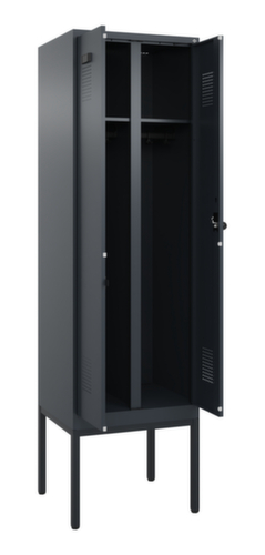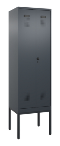 Les principales dimensions de C+P l’armoire vestiaire Evolo PLUS en un coup d’œil :par compartiment une tablette à chapeaux soudée au-dessus d’une tringle avec 3 doubles crochets coulissants anti-torsion. Les double portes battantes peuvent être facilement personnalisées grâce au porte-étiquette pratique. Malgré la perforation décorative design qui est essentielle pour l'aération, l'armoire reste dans l'ensemble lisse, hygiénique et facile à nettoyer. Les gonds intérieurs des portes battantes offrent l’avantage d’un visuel net, car aucune vis ou charnière n’est visible de l’extérieur. Le design de l’armoire n’est donc pas altéré et l’ensemble du meuble semble de meilleure qualité. La surface lisse est également plus facile à nettoyer, car aucun dépôt de saleté ou de poussière n’est à craindre aux endroits inaccessibles. Chaque porte est équipée de série d’un amortisseur, de sorte que, même fermée avec élan, elle ne claque pas. Cela contribue non seulement à améliorer l’environnement sonore, mais protège aussi l’armoire en acier des dommages. La structure BIONIC Steel Frame, inspirée de la nature, est une construction particulièrement efficace et stable. La structure interne raffinée composée de pliages, d’entretoises et d’espaces, ainsi que la plus grande épaisseur de matériau aux endroits cruciaux, comme à l’avant des parois latérales et dans les profilés de cloisons et de caissons, augmentent encore la rigidité. Chaque personne dispose de 2 compartiments qui peuvent être verrouillés ensemble via des portes convergentes. Cela permet de séparer de manière simple et efficace les vêtements de travail et ceux de tous les jours. Le concept d'auto-aération sophistiqué permet une circulation optimisée de l'air. Des espaces d'aération définis devant et derrière la tablette dans le dessous et dans le dessus du compartiment, en combinaison avec la perforation décorative dans la porte, contribuent à un flux d'air agréable. . L'intérieur de l'armoire est ainsi mieux aéré et son contenu sèche plus vite sans générer de mauvaises odeurs. Le piètement intégré réduit l'accumulation possible de la poussière et de la saleté en facilitant le nettoyage de toute la surface. Crée en plus un espace de rangement supplémentaire sous l'armoire. Les chaussures et les sacs ne sont plus dans le passage, et le risque de trébuchement est minimisé. structure en acier, soudé de manière stable. Cela rend la structure particulièrement robuste et résistante, et donc plus durable. Les coins et les angles soudés du corps garantissent une plus grande étanchéité et donc une meilleure protection contre la poussière, l’humidité et la saleté qu’une structure vissée. En outre, il n’est pas nécessaire de procéder à des travaux d’entretien réguliers ni à des réajustements. corps avec thermolaquage en RAL7016 gris anthracite, face avant avec thermolaquage en RAL7016 gris anthracite.