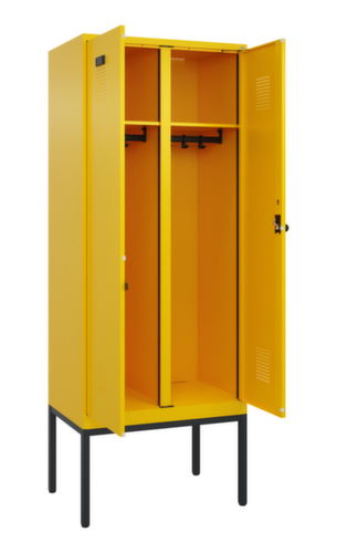 Les principales dimensions de C+P l’armoire vestiaire Evolo PLUS en un coup d’œil :par compartiment une tablette à chapeaux soudée au-dessus d’une tringle avec 3 doubles crochets coulissants anti-torsion. Les double portes battantes peuvent être facilement personnalisées grâce au porte-étiquette pratique. Malgré la perforation décorative design qui est essentielle pour l'aération, l'armoire reste dans l'ensemble lisse, hygiénique et facile à nettoyer. Les gonds intérieurs des portes battantes offrent l’avantage d’un visuel net, car aucune vis ou charnière n’est visible de l’extérieur. Le design de l’armoire n’est donc pas altéré et l’ensemble du meuble semble de meilleure qualité. La surface lisse est également plus facile à nettoyer, car aucun dépôt de saleté ou de poussière n’est à craindre aux endroits inaccessibles. Chaque porte est équipée de série d’un amortisseur, de sorte que, même fermée avec élan, elle ne claque pas. Cela contribue non seulement à améliorer l’environnement sonore, mais protège aussi l’armoire en acier des dommages. La structure BIONIC Steel Frame, inspirée de la nature, est une construction particulièrement efficace et stable. La structure interne raffinée composée de pliages, d’entretoises et d’espaces, ainsi que la plus grande épaisseur de matériau aux endroits cruciaux, comme à l’avant des parois latérales et dans les profilés de cloisons et de caissons, augmentent encore la rigidité. Chaque personne dispose de 2 compartiments qui peuvent être verrouillés ensemble via des portes convergentes. Cela permet de séparer de manière simple et efficace les vêtements de travail et ceux de tous les jours. Le concept d'auto-aération sophistiqué permet une circulation optimisée de l'air. Des espaces d'aération définis devant et derrière la tablette dans le dessous et dans le dessus du compartiment, en combinaison avec la perforation décorative dans la porte, contribuent à un flux d'air agréable. . L'intérieur de l'armoire est ainsi mieux aéré et son contenu sèche plus vite sans générer de mauvaises odeurs. Le piètement intégré réduit l'accumulation possible de la poussière et de la saleté en facilitant le nettoyage de toute la surface. Crée en plus un espace de rangement supplémentaire sous l'armoire. Les chaussures et les sacs ne sont plus dans le passage, et le risque de trébuchement est minimisé. structure en acier, soudé de manière stable. Cela rend la structure particulièrement robuste et résistante, et donc plus durable. Les coins et les angles soudés du corps garantissent une plus grande étanchéité et donc une meilleure protection contre la poussière, l’humidité et la saleté qu’une structure vissée. En outre, il n’est pas nécessaire de procéder à des travaux d’entretien réguliers ni à des réajustements. corps avec thermolaquage en RAL1023 jaune signalisation, face avant avec thermolaquage en RAL1023 jaune signalisation.