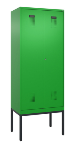 Les principales dimensions de C+P l’armoire vestiaire Evolo PLUS en un coup d’œil :par compartiment une tablette à chapeaux soudée au-dessus d’une tringle avec 3 doubles crochets coulissants anti-torsion. Les double portes battantes peuvent être facilement personnalisées grâce au porte-étiquette pratique. Malgré la perforation décorative design qui est essentielle pour l'aération, l'armoire reste dans l'ensemble lisse, hygiénique et facile à nettoyer. Les gonds intérieurs des portes battantes offrent l’avantage d’un visuel net, car aucune vis ou charnière n’est visible de l’extérieur. Le design de l’armoire n’est donc pas altéré et l’ensemble du meuble semble de meilleure qualité. La surface lisse est également plus facile à nettoyer, car aucun dépôt de saleté ou de poussière n’est à craindre aux endroits inaccessibles. Chaque porte est équipée de série d’un amortisseur, de sorte que, même fermée avec élan, elle ne claque pas. Cela contribue non seulement à améliorer l’environnement sonore, mais protège aussi l’armoire en acier des dommages. La structure BIONIC Steel Frame, inspirée de la nature, est une construction particulièrement efficace et stable. La structure interne raffinée composée de pliages, d’entretoises et d’espaces, ainsi que la plus grande épaisseur de matériau aux endroits cruciaux, comme à l’avant des parois latérales et dans les profilés de cloisons et de caissons, augmentent encore la rigidité. verrouillable avec serrure à cylindre. Chaque personne dispose de 2 compartiments qui peuvent être verrouillés ensemble via des portes convergentes. Cela permet de séparer de manière simple et efficace les vêtements de travail et ceux de tous les jours. Le concept d'auto-aération sophistiqué permet une circulation optimisée de l'air. Des espaces d'aération définis devant et derrière la tablette dans le dessous et dans le dessus du compartiment, en combinaison avec la perforation décorative dans la porte, contribuent à un flux d'air agréable. . L'intérieur de l'armoire est ainsi mieux aéré et son contenu sèche plus vite sans générer de mauvaises odeurs. Le piètement intégré réduit l'accumulation possible de la poussière et de la saleté en facilitant le nettoyage de toute la surface. Crée en plus un espace de rangement supplémentaire sous l'armoire. Les chaussures et les sacs ne sont plus dans le passage, et le risque de trébuchement est minimisé. structure en acier, soudé de manière stable. Cela rend la structure particulièrement robuste et résistante, et donc plus durable. Les coins et les angles soudés du corps garantissent une plus grande étanchéité et donc une meilleure protection contre la poussière, l’humidité et la saleté qu’une structure vissée. En outre, il n’est pas nécessaire de procéder à des travaux d’entretien réguliers ni à des réajustements. corps avec thermolaquage en RAL 6037 Vert pur, face avant avec thermolaquage en RAL 6037 Vert pur.