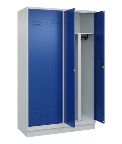 . Les principales dimensions de C+P l’armoire vestiaire Classic Plus en un coup d’œil :par compartiment 1 tringle robuste à profil ovale avec 3 doubles crochets coulissants anti-torsion, au-dessus une tablette à chapeaux continue tous les 2 compartiments. Cette tablette extra large offre un espace de rangement idéal pour les EPI comme les casques, les protections oculaires ou auditives. porte à double battant avec fentes d’aération et porte-étiquette. Les gonds intérieurs des portes battantes offrent l’avantage d’un visuel net, car aucune vis ou charnière n’est visible de l’extérieur. Le design de l’armoire n’est donc pas altéré et l’ensemble du meuble semble de meilleure qualité. La surface lisse est également plus facile à nettoyer, car aucun dépôt de saleté ou de poussière n’est à craindre aux endroits inaccessibles. Chaque porte est équipée de série d’un amortisseur, de sorte que, même fermée avec élan, elle ne claque pas. Cela contribue non seulement à améliorer l’environnement sonore, mais protège aussi l’armoire en acier des dommages. La structure BIONIC Steel Frame, inspirée de la nature, est une construction particulièrement efficace et stable. La structure interne raffinée composée de pliages, d’entretoises et d’espaces, ainsi que la plus grande épaisseur de matériau aux endroits cruciaux, comme à l’avant des parois latérales et dans les profilés de cloisons et de caissons, augmentent encore la rigidité. verrouillable avec serrure à cylindre. Chaque personne dispose de 2 compartiments qui peuvent être verrouillés ensemble via des portes convergentes. Cela permet de séparer de manière simple et efficace les vêtements de travail et ceux de tous les jours. Les orifices de ventilation supplémentaires dans le compartiment, combinés aux fentes d’aération dans la porte, améliorent le flux d’air. L’intérieur de l’armoire est ainsi mieux ventilé et son contenu sèche plus vite, sans générer de mauvaises odeurs. Le socle encastré permet de répartir uniformément le poids de l’armoire sur le sol. Cela augmente la stabilité et l’armoire peut supporter des charges plus lourdes qu’une armoire à pieds. De plus, la saleté, la poussière et l’humidité ne peuvent pas s’infiltrer sous l’armoire, ce qui réduit la surface de nettoyage. structure en acier, soudé de manière stable. Cela rend la structure particulièrement robuste et résistante, et donc plus durable. Les coins et les angles soudés du corps garantissent une plus grande étanchéité et donc une meilleure protection contre la poussière, l’humidité et la saleté qu’une structure vissée. En outre, il n’est pas nécessaire de procéder à des travaux d’entretien réguliers ni à des réajustements. corps avec thermolaquage en RAL7035 gris clair, face avant avec thermolaquage en RAL5010 bleu gentiane.