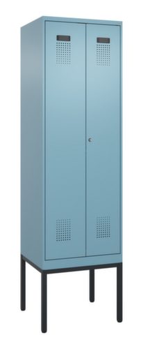 . Les principales dimensions de C+P l’armoire vestiaire Evolo PLUS en un coup d’œil :par compartiment 1 tringle robuste à profil ovale avec 3 doubles crochets coulissants anti-torsion, au-dessus une tablette à chapeaux continue tous les 2 compartiments. Cette tablette extra large offre un espace de rangement idéal pour les EPI comme les casques, les protections oculaires ou auditives. Les double portes battantes peuvent être facilement personnalisées grâce au porte-étiquette pratique. Malgré la perforation décorative design qui est essentielle pour l'aération, l'armoire reste dans l'ensemble lisse, hygiénique et facile à nettoyer. Les gonds intérieurs des portes battantes offrent l’avantage d’un visuel net, car aucune vis ou charnière n’est visible de l’extérieur. Le design de l’armoire n’est donc pas altéré et l’ensemble du meuble semble de meilleure qualité. La surface lisse est également plus facile à nettoyer, car aucun dépôt de saleté ou de poussière n’est à craindre aux endroits inaccessibles. Chaque porte est équipée de série d’un amortisseur, de sorte que, même fermée avec élan, elle ne claque pas. Cela contribue non seulement à améliorer l’environnement sonore, mais protège aussi l’armoire en acier des dommages. La structure BIONIC Steel Frame, inspirée de la nature, est une construction particulièrement efficace et stable. La structure interne raffinée composée de pliages, d’entretoises et d’espaces, ainsi que la plus grande épaisseur de matériau aux endroits cruciaux, comme à l’avant des parois latérales et dans les profilés de cloisons et de caissons, augmentent encore la rigidité. verrouillable avec serrure à cylindre. Chaque personne dispose de 2 compartiments qui peuvent être verrouillés ensemble via des portes convergentes. Cela permet de séparer de manière simple et efficace les vêtements de travail et ceux de tous les jours. Le concept d'auto-aération sophistiqué permet une circulation optimisée de l'air. Des espaces d'aération définis devant et derrière la tablette dans le dessous et dans le dessus du compartiment, en combinaison avec la perforation décorative dans la porte, contribuent à un flux d'air agréable. . L'intérieur de l'armoire est ainsi mieux aéré et son contenu sèche plus vite sans générer de mauvaises odeurs. Le piètement intégré réduit l'accumulation possible de la poussière et de la saleté en facilitant le nettoyage de toute la surface. Crée en plus un espace de rangement supplémentaire sous l'armoire. Les chaussures et les sacs ne sont plus dans le passage, et le risque de trébuchement est minimisé. structure en acier, soudé de manière stable. Cela rend la structure particulièrement robuste et résistante, et donc plus durable. Les coins et les angles soudés du corps garantissent une plus grande étanchéité et donc une meilleure protection contre la poussière, l’humidité et la saleté qu’une structure vissée. En outre, il n’est pas nécessaire de procéder à des travaux d’entretien réguliers ni à des réajustements. corps avec thermolaquage en RAL 2406015 bleu d'architecte, face avant avec thermolaquage en RAL 2406015 bleu d'architecte.