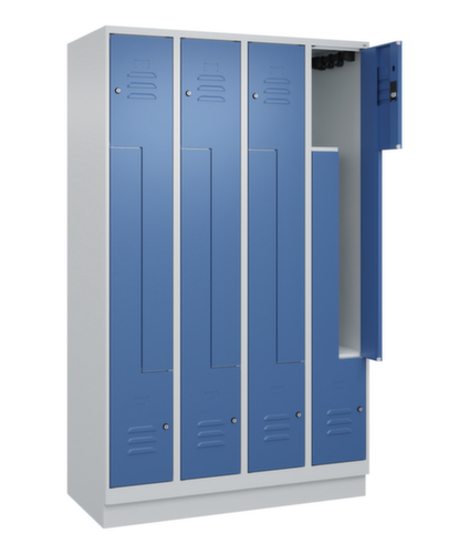 Les principales dimensions de C+P l’armoire vestiaire Classic Plus en un coup d’œil :par compartiment 1 tringle avec 3 doubles crochets coulissants anti-torsion. porte battante avec porte-étiquette et fentes d’aération. Les gonds intérieurs des portes battantes offrent l’avantage d’un visuel net, car aucune vis ou charnière n’est visible de l’extérieur. Le design de l’armoire n’est donc pas altéré et l’ensemble du meuble semble de meilleure qualité. La surface lisse est également plus facile à nettoyer, car aucun dépôt de saleté ou de poussière n’est à craindre aux endroits inaccessibles. Chaque porte est équipée de série d’un amortisseur, de sorte que, même fermée avec élan, elle ne claque pas. Cela contribue non seulement à améliorer l’environnement sonore, mais protège aussi l’armoire en acier des dommages. La structure BIONIC Steel Frame, inspirée de la nature, est une construction particulièrement efficace et stable. La structure interne raffinée composée de pliages, d’entretoises et d’espaces, ainsi que la plus grande épaisseur de matériau aux endroits cruciaux, comme à l’avant des parois latérales et dans les profilés de cloisons et de caissons, augmentent encore la rigidité. verrouillable avec serrure à cylindre. Les orifices de ventilation supplémentaires dans le compartiment, combinés aux fentes d’aération dans la porte, améliorent le flux d’air. L’intérieur de l’armoire est ainsi mieux ventilé et son contenu sèche plus vite, sans générer de mauvaises odeurs. Le socle encastré permet de répartir uniformément le poids de l’armoire sur le sol. Cela augmente la stabilité et l’armoire peut supporter des charges plus lourdes qu’une armoire à pieds. De plus, la saleté, la poussière et l’humidité ne peuvent pas s’infiltrer sous l’armoire, ce qui réduit la surface de nettoyage. structure en acier, soudé de manière stable. Cela rend la structure particulièrement robuste et résistante, et donc plus durable. Les coins et les angles soudés du corps garantissent une plus grande étanchéité et donc une meilleure protection contre la poussière, l’humidité et la saleté qu’une structure vissée. En outre, il n’est pas nécessaire de procéder à des travaux d’entretien réguliers ni à des réajustements. corps avec thermolaquage en RAL7035 gris clair, face avant avec thermolaquage en RAL5023 bleu distant.