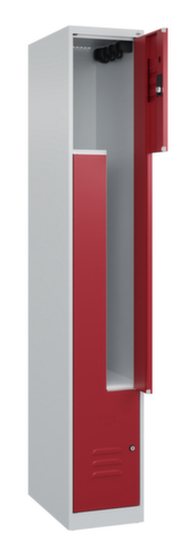 Les principales dimensions de C+P l’armoire vestiaire Classic Plus en un coup d’œil :par compartiment 1 tringle avec 3 doubles crochets coulissants anti-torsion. porte battante avec porte-étiquette et fentes d’aération. Les gonds intérieurs des portes battantes offrent l’avantage d’un visuel net, car aucune vis ou charnière n’est visible de l’extérieur. Le design de l’armoire n’est donc pas altéré et l’ensemble du meuble semble de meilleure qualité. La surface lisse est également plus facile à nettoyer, car aucun dépôt de saleté ou de poussière n’est à craindre aux endroits inaccessibles. Chaque porte est équipée de série d’un amortisseur, de sorte que, même fermée avec élan, elle ne claque pas. Cela contribue non seulement à améliorer l’environnement sonore, mais protège aussi l’armoire en acier des dommages. La structure BIONIC Steel Frame, inspirée de la nature, est une construction particulièrement efficace et stable. La structure interne raffinée composée de pliages, d’entretoises et d’espaces, ainsi que la plus grande épaisseur de matériau aux endroits cruciaux, comme à l’avant des parois latérales et dans les profilés de cloisons et de caissons, augmentent encore la rigidité. verrouillable avec serrure à cylindre. Les orifices de ventilation supplémentaires dans le compartiment, combinés aux fentes d’aération dans la porte, améliorent le flux d’air. L’intérieur de l’armoire est ainsi mieux ventilé et son contenu sèche plus vite, sans générer de mauvaises odeurs. Pour une apparence fine et un gain de place, l’armoire se pose directement au sol sans socle ni pieds. Des vis de mise à niveau assurent une pose sans vacillement en cas d’éventuelles irrégularités du sol. Le fond de l’armoire est galvanisé pour une protection anticorrosion améliorée. structure en acier, soudé de manière stable. Cela rend la structure particulièrement robuste et résistante, et donc plus durable. Les coins et les angles soudés du corps garantissent une plus grande étanchéité et donc une meilleure protection contre la poussière, l’humidité et la saleté qu’une structure vissée. En outre, il n’est pas nécessaire de procéder à des travaux d’entretien réguliers ni à des réajustements. corps avec thermolaquage en RAL7035 gris clair, face avant avec thermolaquage en RAL3003 rouge rubis.