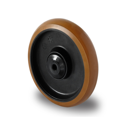 "description": "force 250kg, Ø 125mm, moyeu L 50mm, bandage PU, roulement à billes, jante polyamide, pare-fils",