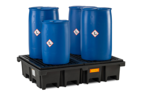"metaDescription": "Cemo Bac de rétention PE - p. fût 4x200l, vol. rétention 425l, HxlxP 390x1670x1270mm, a. caillebotis PE, passages de fourche",