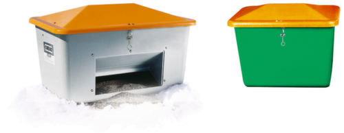 "description": "1100l, HxlxP 1010x1630x1210mm, plastique renforcé de fibre de verre, gris, couvercle orange, parois a. empiètement",