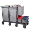 Le chariot de service fermé répond aux normes d'hygiène les plus strictes pour une utilisation quotidienne dans le secteur médical et de l'HoReCa. Des roulettes hygiéniques fermées, seaux et boîtes pour balai à franges ainsi que des surfaces lisses et facile à nettoyer permettent une utilisation dans le respect des règles d'hygiène les plus strictes. L'unité d'approvisionnement et l'unité d'élimination sont toutes deux dotées de portes verrouillables. L'unité d'approvisionnement accueille 4 seaux qui s'encastrent dans une tablette de rétention plate pour un maintien sécurisé. Les 3 tablettes de rétention centrales offrent beaucoup d'espace pour le rangement de produits et d'ustensiles de nettoyage. Il est également possible de déposer complètement les tablettes pour ranger un aspirateur. Les anses des seaux ont des couleurs différentes et ce code à 4 couleurs facilite l'identification du seau de nettoyage adapté à des tâches ou des zones spécifiques. Vous pouvez ainsi réduire de risque de contamination croisée et d'utilisation du produit de nettoyage inapproprié. Les couvercles transparents à poser contribuent également au respect des normes d'hygiène élevées. Vous pouvez personnaliser l'unité d'élimination en fonction de vos besoins grâce aux étriers de fixation de sacs poubelle compris dans le volume de livraison. Il est possible de disposer par exemple jusqu'à quatre sacs de 35 litres ou deux sacs de 70 litres.. Les armoires peuvent être verrouillées avec des clés amovibles pour leur sécurisation dans les lieux publics.