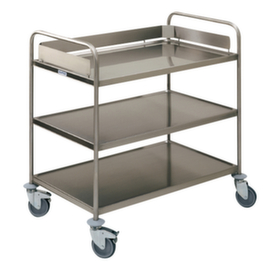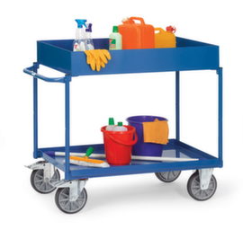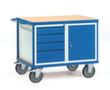 "longDescription": "<h2>Chariots de table et d'armoire</h2><strong>Capacité de charge jusqu'à 600 kg</strong><br><ul><li>Construction en acier soudé, revêtement par poudre, chariot et façade d'armoire RAL 5007 gris brillant, corps d'armoire gris clair RAL 7035</li><li>Plan de travail en panneau sandwich de 19 mm d'épaisseur, avec ou sans rebord de 80 mm de hauteur</li><li>Armoire avec 1 étagère fixe et 2 étagères réglables et porte à charnière, tiroirs avec guides coulissants.</li><li>Au choix, avec 4 ou 6 tiroirs</li><li>2 roulettes pivotantes et 2 roulettes fixes avec pneus TPE, roulettes pivotantes avec frein, moyeu à roulement à billes.</li></ul><br>Le chariot pour tables et armoires avec tiroirs de fetra offre une protection de la charge pendant le transport. La construction robuste et stable de ce chariot d'atelier est assurée par l'utilisation de l'acier - sa surface est recouverte d'un revêtement en poudre et donc très insensible, ainsi que résistante aux chocs et aux rayures. Une plateforme permet un rangement et un retrait pratiques. Il est équipé de 2 roulettes pivotantes et de 2 roulettes fixes (roulettes pivotantes avec frein) avec des pneus en TPE. <br><ul><li>Garantie de 10 ans </li><li>Freins normalisés selon la norme EN 1757-3</li></ul>",