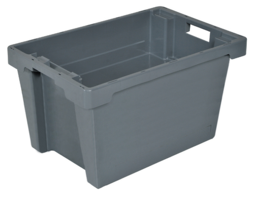 en polyéthylène résistant aux chocs en gris. parois plein, tablette plein. manutention facile avec poignées ouvertes. emboitable par rotation à 180°. convient pour aliments. Adapté aux convoyeurs à rouleaux. résistant à la température de -40 °C à +60 °C.