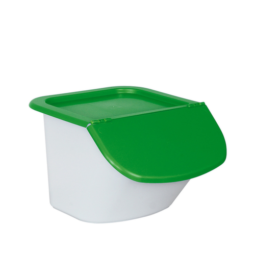 en polypropylène incassable. récipient en blanc et couvercle en vert. parois : surfaces lisses sans soudures pour un nettoyage facile. équipé de avec une pelle qui peut être accrochée dans le récipient conformément aux directives HACCP. convient pour pour produits en vrac de toute nature. verrouillable avec couvercle rabattable. Le couvercle peut également être ouvert lorsque plusieurs bacs sont empilés. Le contenu du distributeur peut être facilement prélevé grâce à l’ouverture de prise inclinée. convient pour aliments.