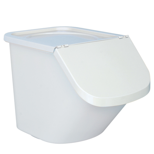 en polypropylène incassable. récipient en blanc et couvercle en blanc. parois : surfaces lisses sans soudures pour un nettoyage facile. convient pour pour produits en vrac de toute nature. verrouillable avec couvercle rabattable. Le couvercle peut également être ouvert lorsque plusieurs bacs sont empilés. Le contenu du distributeur peut être facilement prélevé grâce à l’ouverture de prise inclinée. convient pour aliments.